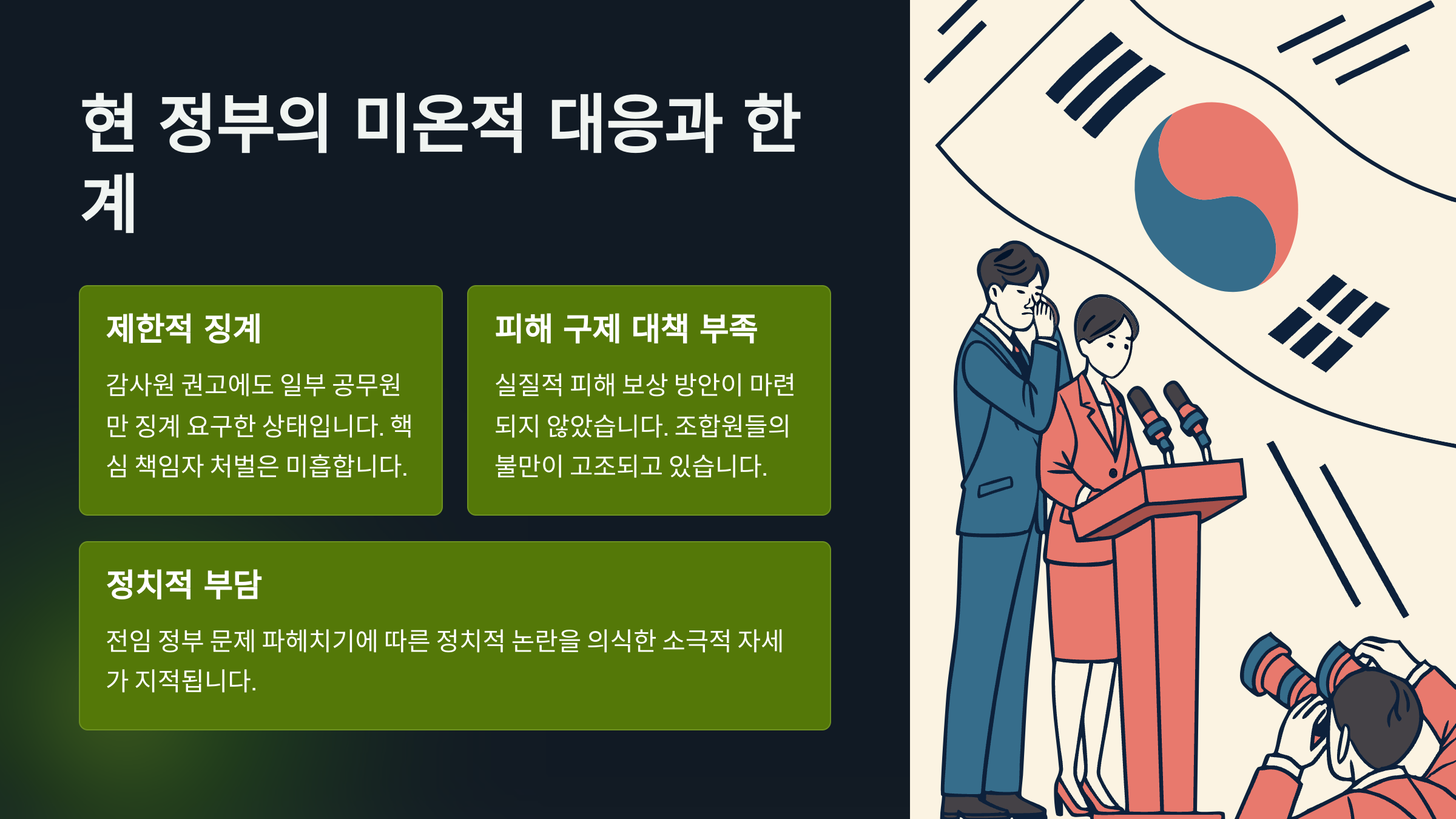 정권이 교체된 이후에도 관련 인사들이 그대로 공직에 남아 있고, 검찰 수사나 감사원의 후속 조치가 미비하다는 비판이 제기되고 있습니다. 일부에서는 윤석열 정부가 전 정권 심판에 소극적이었기 때문에 이 사안이 묻히고 있다고 분석합니다. 이는 정치적 중립성을 의식한 결정일 수 있으나, 정의 구현에 실패한 결과가 될 수도 있습니다.