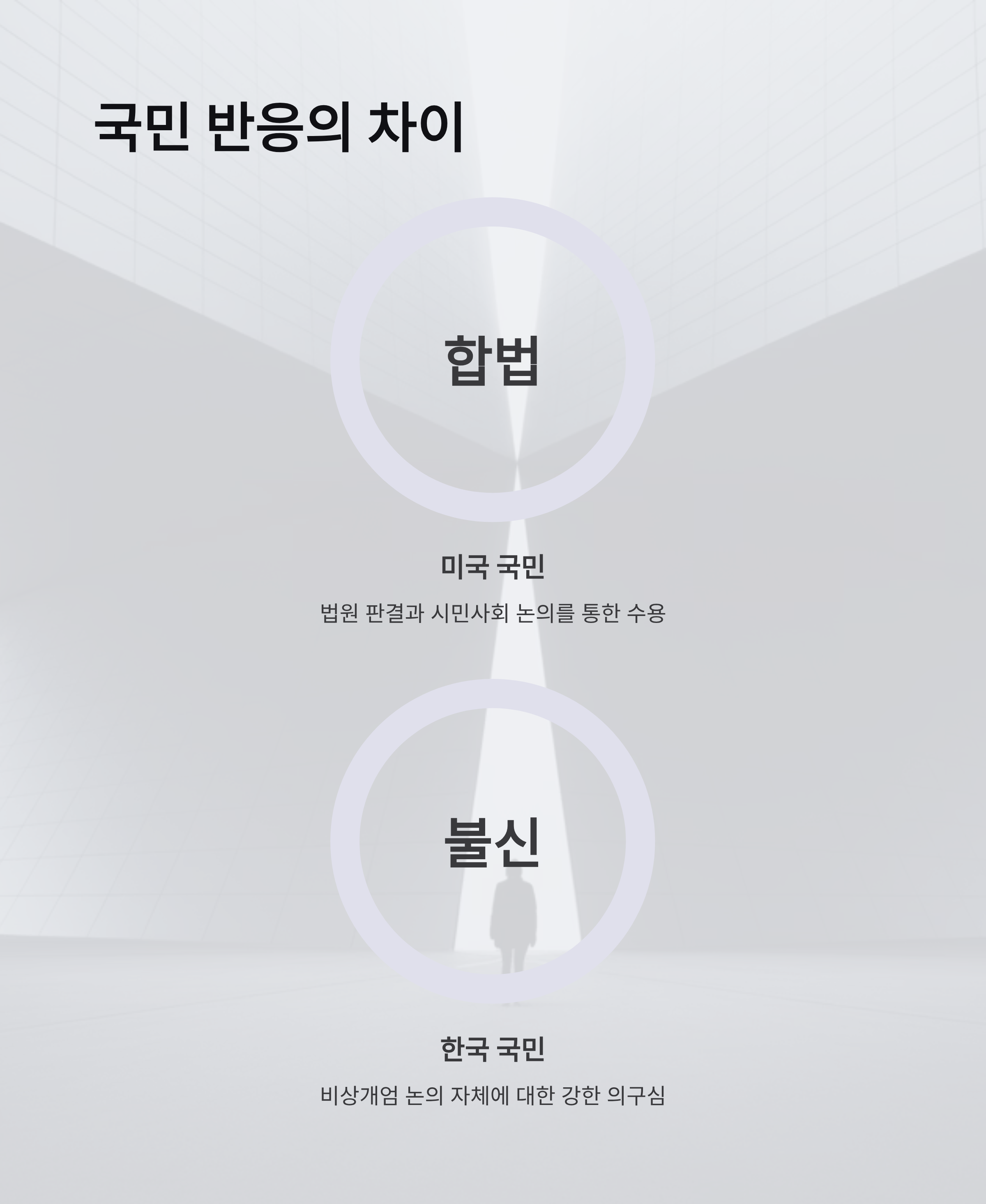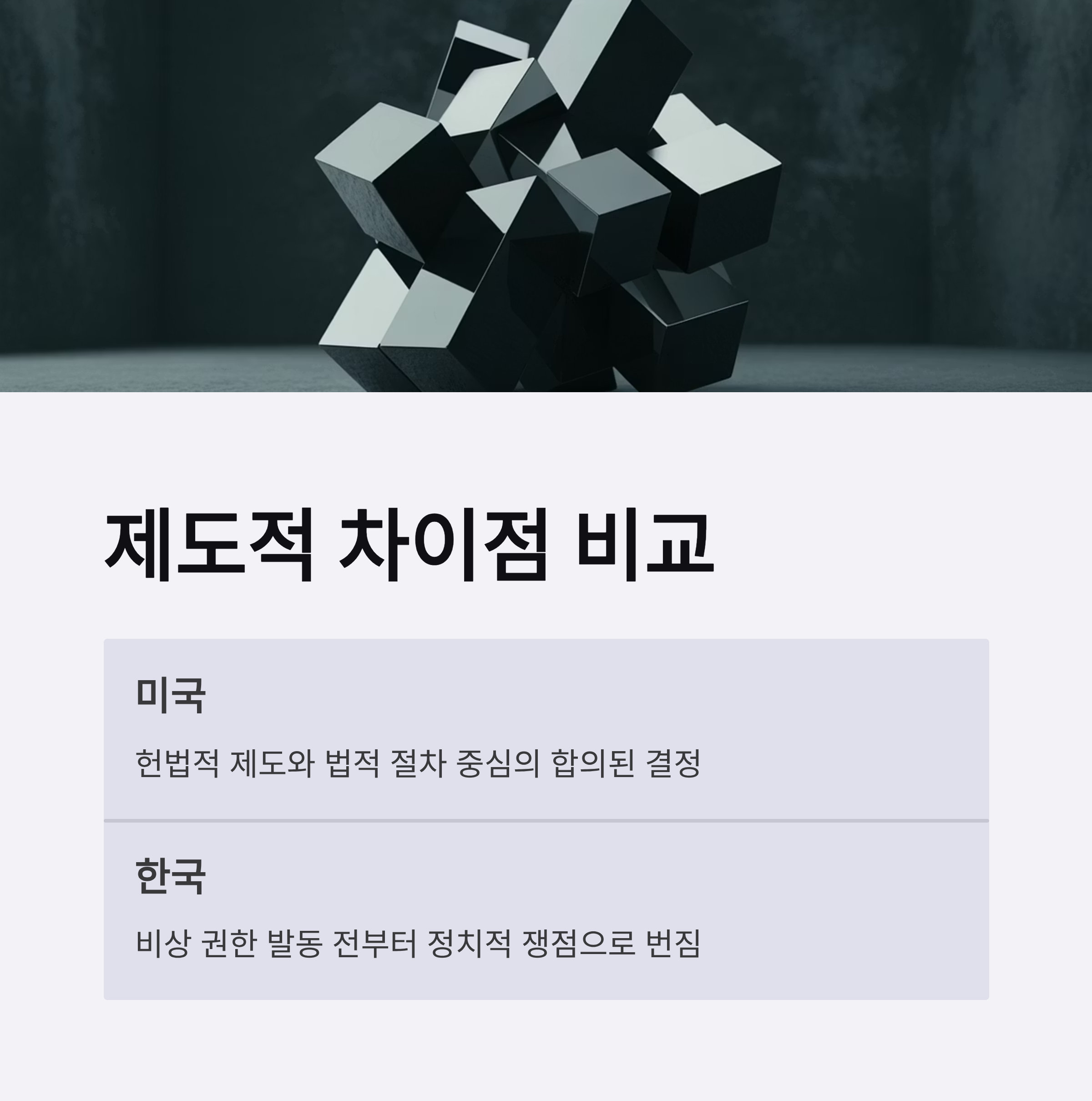 4. 미국은 비상 권한이 법적 판단과 절차를 기반으로 운영되지만, 한국은 정치적 대립이 그 본질을 흐리게 만드는 경향이 보입니다.