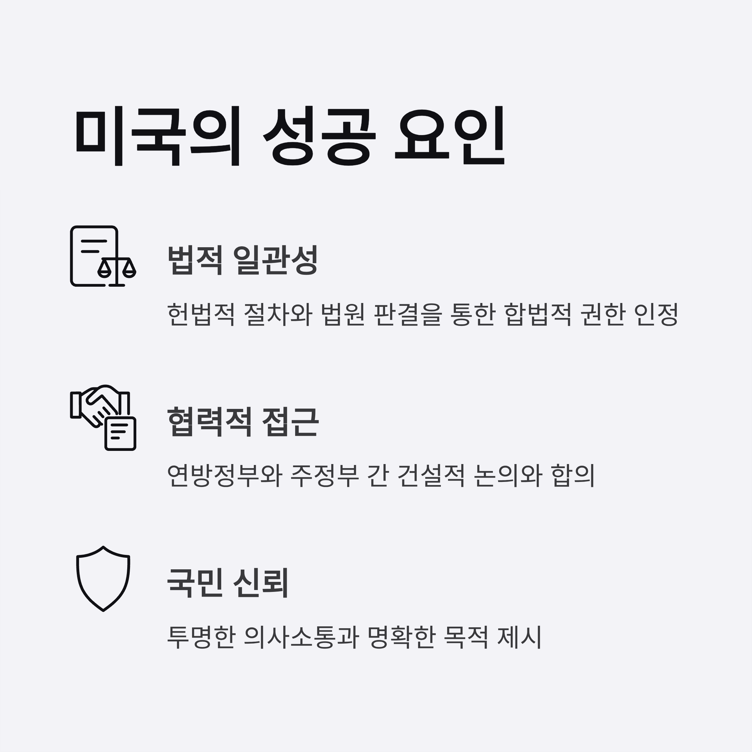 선진적 대응 시스템의 핵심적인 요소는 '법적 해석의 일관성'과 '국민 신뢰'입니다. 미국에서 주 방위군 투입은 법원 판결과 시민 사회의 논의를 통해 합법적 권한으로 받아들여졌습니다. 반면 한국에서는 비상 개엄 논의 자체가 정치 갈등에 휘말리며 국민들에게 불신을 초래하는 결과로 이어졌습니다.