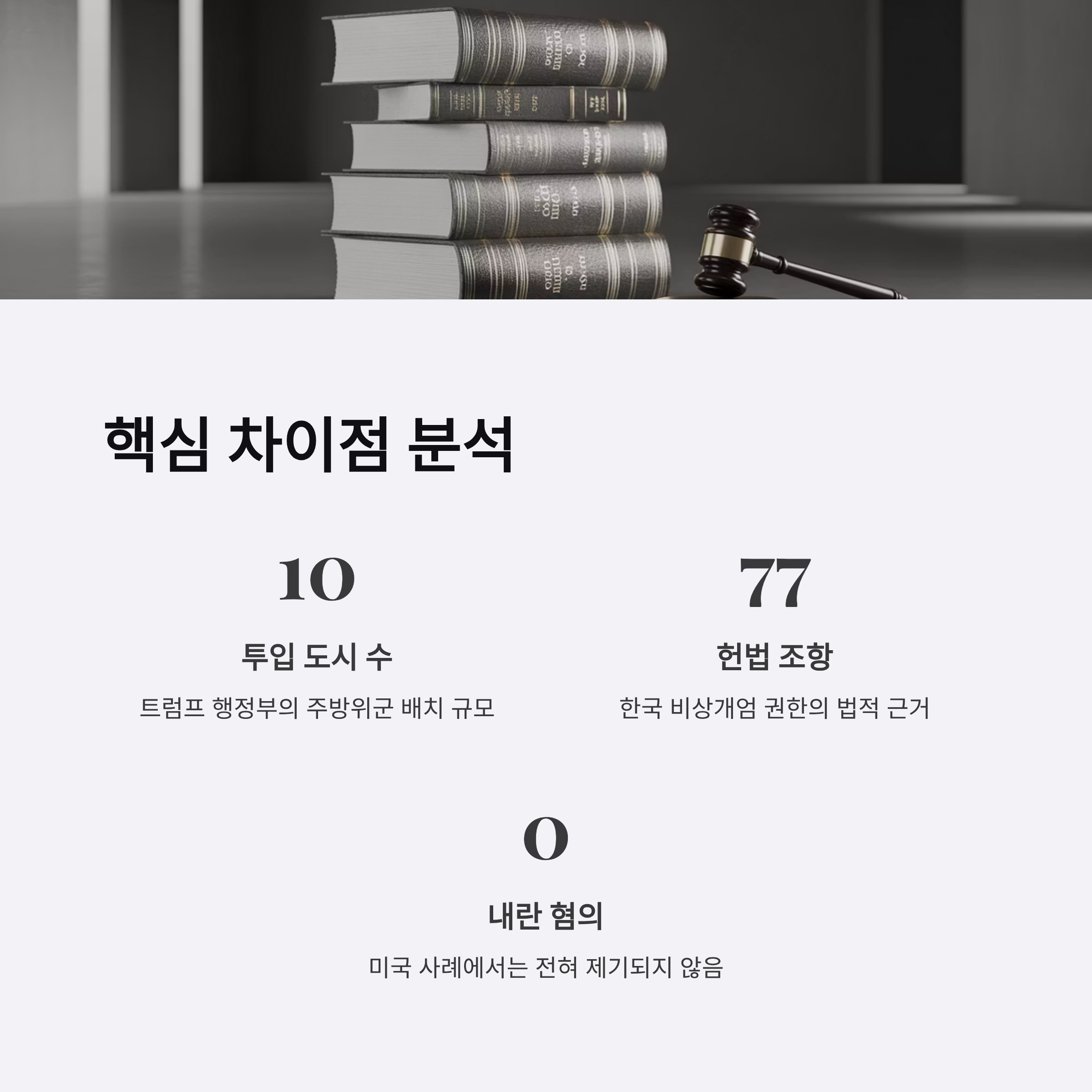 미국과 한국은 서로 다른 정치 체제와 문화적 특성을 지닌 국가로, 비상 상황에 대한 대응 방식에도 큰 차이를 보입니다. 최근 트럼프 전 대통령의 주방위군 투입 사례와 윤석열 대통령의 비상 개엄 논란은, 각각의 국가에서 대통령의 비상 권한 사용이 어떻게 해석될 수 있는지를 잘 보여주는 중요한 사례들입니다.