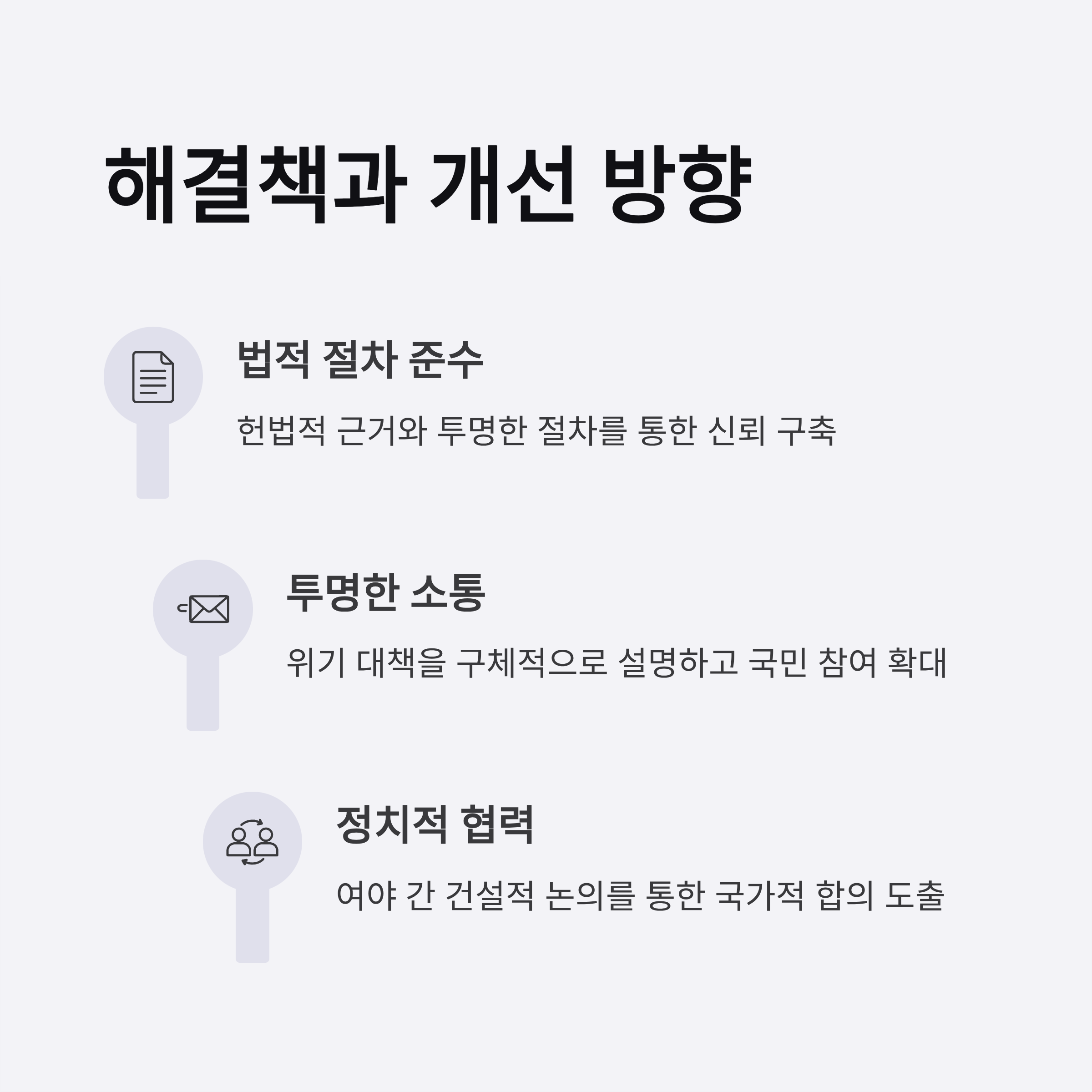 | A. 법적 절차 준수와 더불어 투명한 의사소통이 중요합니다. 대통령과 정부는 위기 대책을 구체적으로 설명하고, 국민 참여를 통해 권한 사용의 신뢰성을 높일 수 있습니다. |