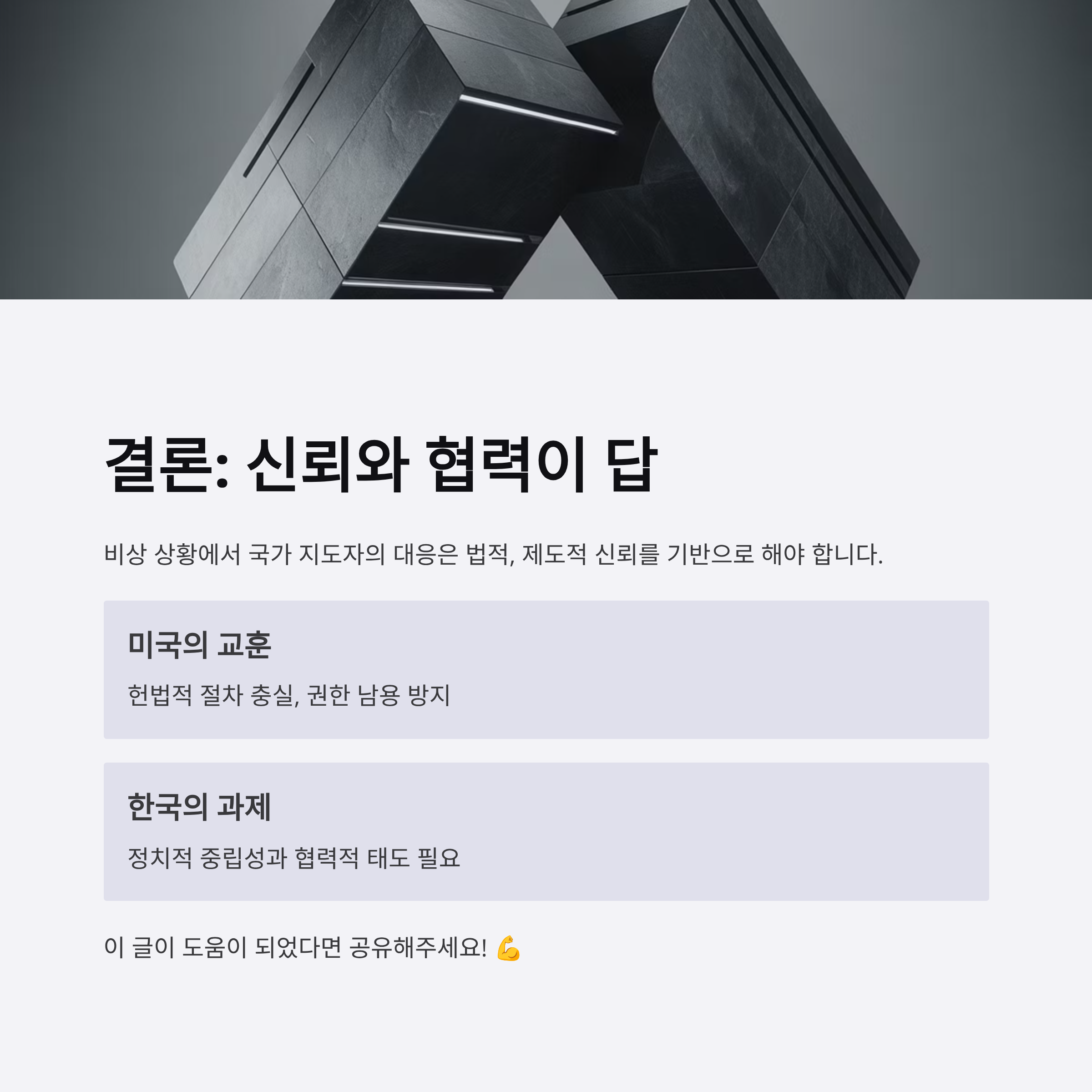 미국과 한국의 사례 분석은 비상 상황에서 국가 지도자의 대응이 법적, 제도적 신뢰를 기반으로 이루어져야 함을 보여줍니다. 미국은 헌법적 절차에 충실하며, 비상 권한 남용이나 불필요한 오해를 피합니다. 반면 한국은 대통령 권한의 행사 자체가 분열의 초점이 되면서 대중의 혼란을 가중시키고 있는 상황입니다.
