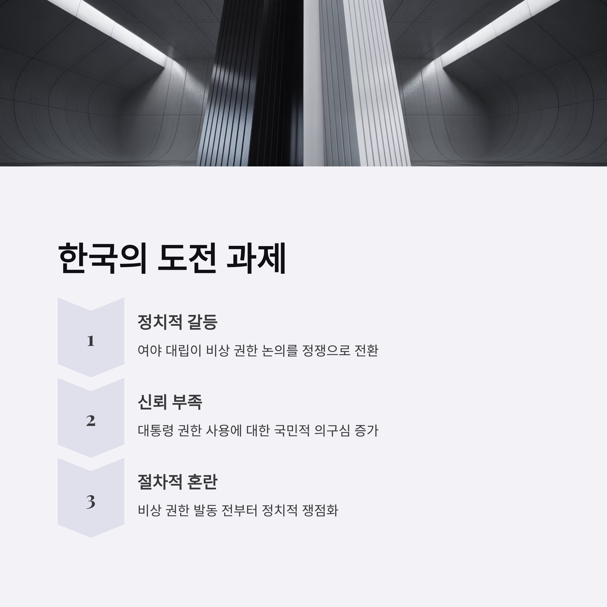 이 논란은 한국의 정치 환경과 밀접한 연관이 있습니다. 정부와 야당의 대립, 대통령 권한 사용에 대한 국민 불신이 핵심 요인으로 작용하며, 비상 사태 당시에도 공적 논의나 협력이 아닌 정쟁으로 전환되고 있는 모습이 나타납니다. 이로 인해 비상 권한의 적용 가능성과 신뢰성은 약화되는 경향이 있습니다.