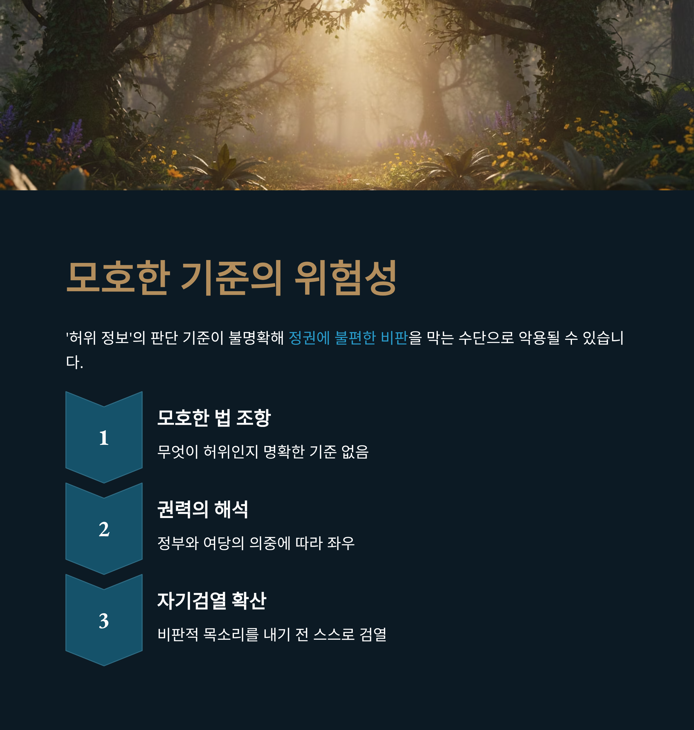 권력의 자의적 판단: 허위 여부를 판단하는 최종 권한이 사실상 정부·여당에 귀속되어 권력 비판을 위축시키는 '자기검열'을 유발할 수 있습니다.