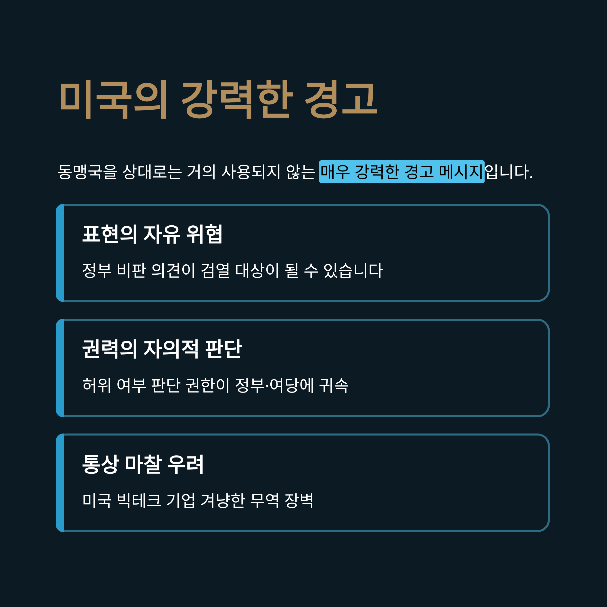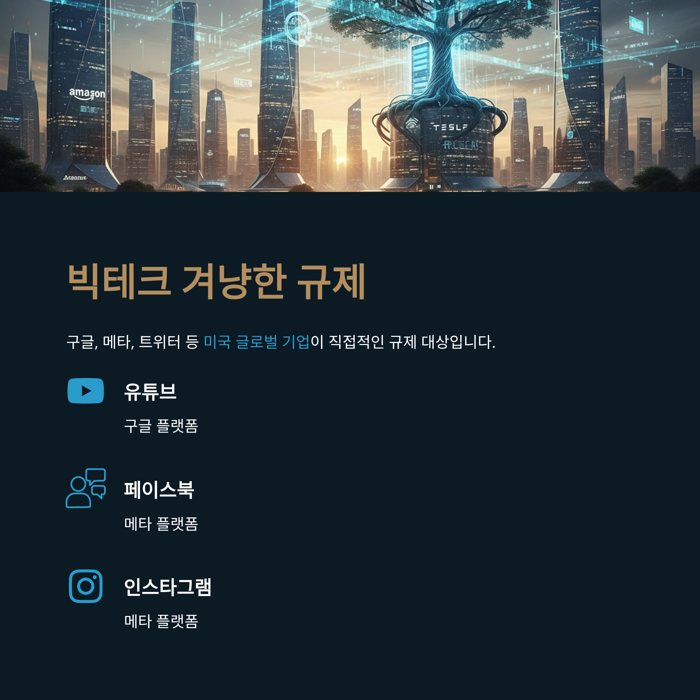미국 국무부의 성명은 단순히 인권과 민주주의라는 가치의 문제에만 국한되지 않습니다. 성명서에는 "미국 기반 플랫폼 기업에 부정적 영향을 미친다", "디지털 서비스에 불필요한 장벽을 만들어선 안 된다"는 문구가 명확히 포함되어 있습니다. 이는 이번 정보통신망법 개정안을 자국 기업에 대한 차별적 규제이자 무역 장벽으로 인식하고 있음을 명백히 드러낸 것입니다. 실제로 이 법의 직접적인 규제 대상에는 구글(유튜브), 메타(페이스북, 인스타그램), 트위터 등 미국을 대표하는 글로벌 빅테크 기업들이 모두 포함됩니다. 이들에게 최대 5배에 달하는 징벌적 손해배상 책임은 한국 시장에서의 사업 활동에 심각한 불확실성을 안겨주는 요소입니다.