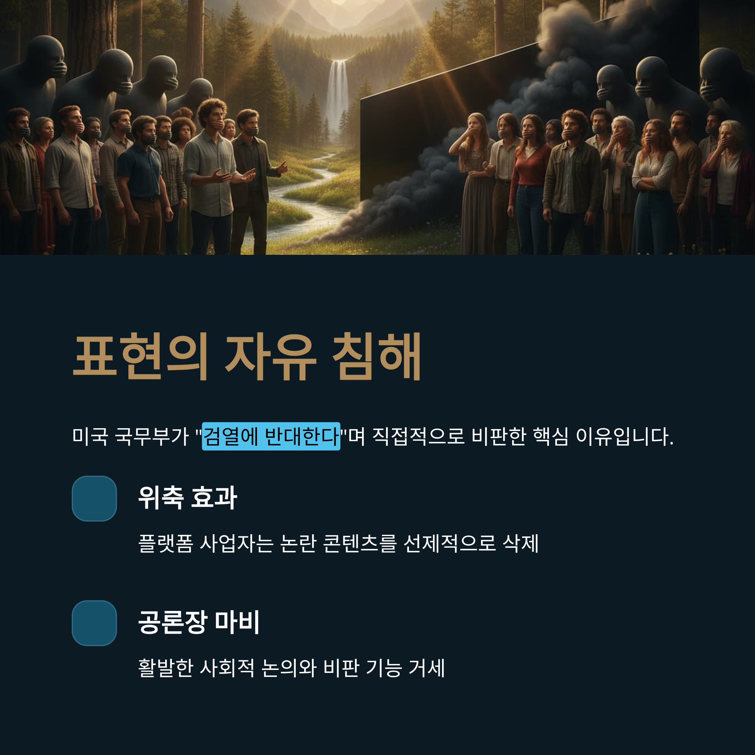미국 국무부가 "검열에 반대한다"며 "자유롭고 개방된 디지털 환경을 훼손한다"고 직접적으로 비판한 이유가 바로 여기에 있습니다. 이들은 해당 법안이 민주주의의 핵심 가치인 표현의 자유를 근본적으로 침해한다고 본 것입니다. 권력에 의해 자의적으로 해석될 수 있는 법 조항은 국민과 언론, 그리고 모든 콘텐츠 창작자들에게 강력한 '위축 효과(Chilling Effect)'를 가져옵니다. 플랫폼 사업자는 막대한 징벌적 배상 책임을 피하기 위해 논란의 소지가 있는 콘텐츠를 선제적으로 삭제하거나 비공개 처리할 것이고, 이용자들은 비판적인 목소리를 내기 전 자기검열을 할 수밖에 없습니다. 이는 활발한 공론의 장을 마비시키고, 건강한 사회적 비판 기능을 거세하는 결과를 초래할 수 있는 매우 위험한 조치입니다.