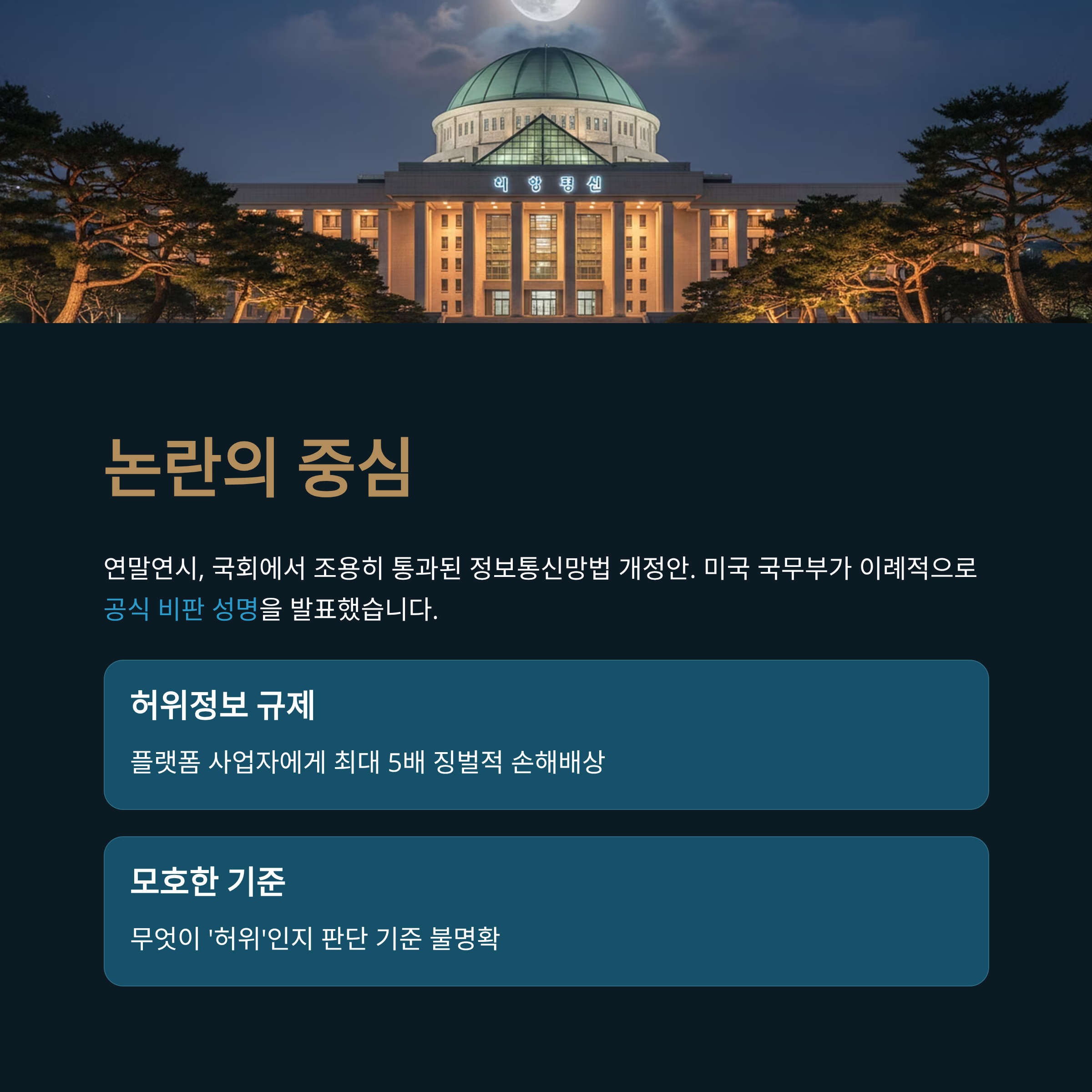 연말연시, 정치적 무관심이 깊어지는 시기에 대한민국 국회에서 중대한 법안 하나가 통과되었습니다. 바로 더불어민주당 주도로 처리된 '정보통신망법 개정안'입니다. 대부분의 국민이 모르고 지나갈 수 있는 이 법안에 대해 동맹국인 미국 국무부가 "표현의 자유를 훼손하는 심각한 우려"를 표명하며 공식 비판 성명을 발표하는 이례적인 사건이 발생했습니다. 이는 단순한 외교적 수사가 아닌, 동맹국을 상대로는 거의 사용되지 않는 매우 강력한 경고 메시지로 해석됩니다. 허위·불법 정보 유통을 막겠다는 명분 뒤에 숨겨진 위험성은 무엇일까요? '허위'와 '불법'을 판단하는 모호한 기준은 누구에게 권한을 부여하며, 그 권한은 어떻게 사용될 수 있을까요? 이 글에서는 미국 국무부가 이례적으로 직접 비판에 나선 이유를 세 가지 측면에서 심층적으로 분석하고, 정보통신망법 개정안이 표현의 자유와 디지털 생태계, 나아가 한미 관계에 미칠 파장을 진단하고자 합니다. 이 법안이 단순한 산업 규제를 넘어 우리 사회의 근간인 자유민주주의 가치를 어떻게 위협하는지 명확히 짚어볼 것입니다.