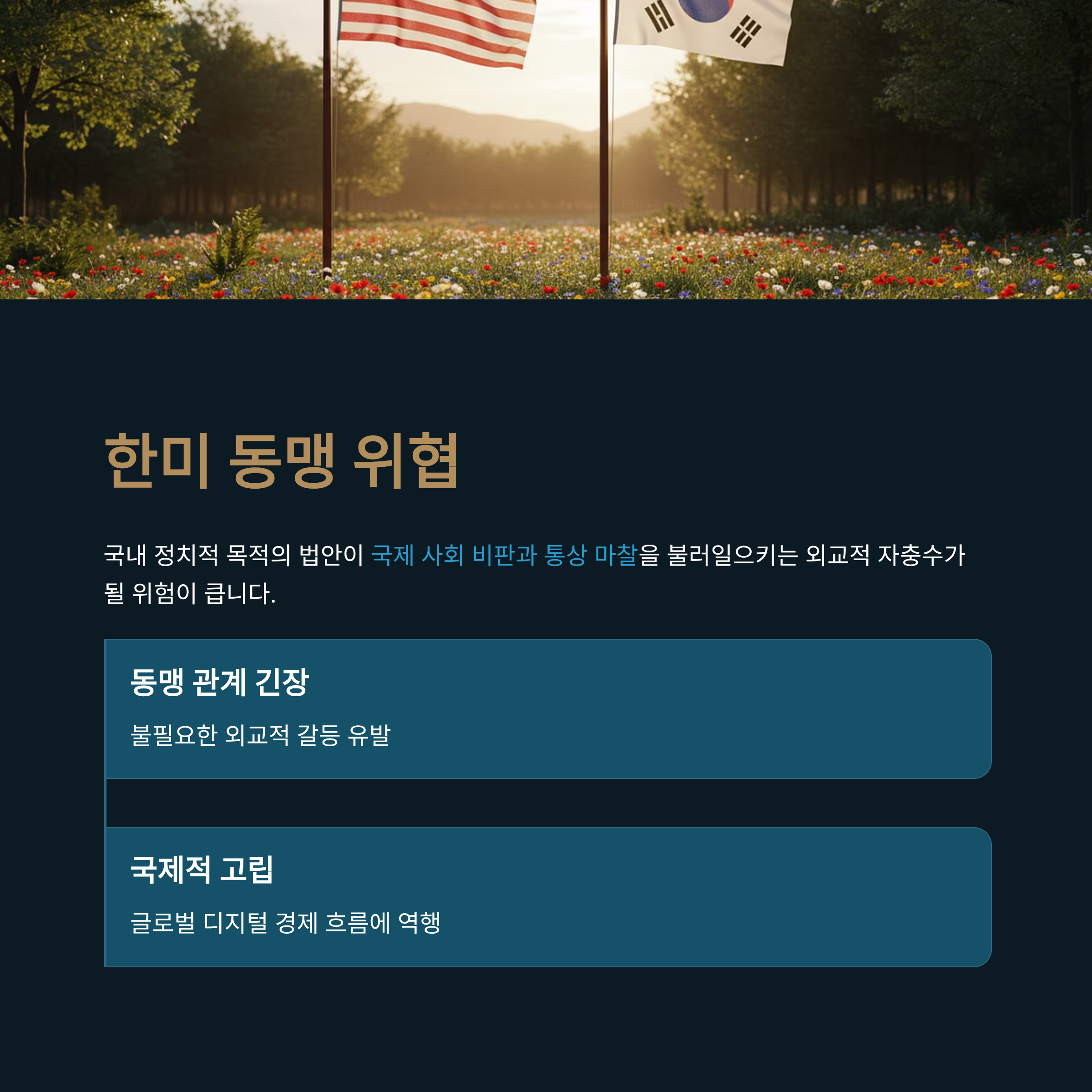 이처럼 미국이 자국 기업의 이익과 직결된 문제로 판단했기에, 이번 사안은 표현의 자유 문제를 넘어 통상 압박이라는 두 번째 전선을 형성하고 있습니다. 미 국무부가 이례적으로 차관급 인사부터 대변인까지 연이어 비판의 목소리를 내는 것은, 이 문제가 외교적·경제적 문제로 비화될 수 있다는 강력한 경고 신호입니다. 만약 한국 정부가 법안 시행을 강행할 경우, 미국은 무역 보복 조치를 포함한 다양한 압박 카드를 검토할 수 있습니다. 이는 한미 동맹 관계에 불필요한 긴장을 유발하고, 글로벌 디지털 경제의 흐름에 역행하는 고립을 자초하는 결과를 낳을 수 있습니다. 즉, 국내의 정치적 목적으로 추진된 법안이 국제 사회의 비판과 함께 심각한 통상 마찰까지 불러일으키는 외교적 자충수가 될 위험이 매우 큽니다.