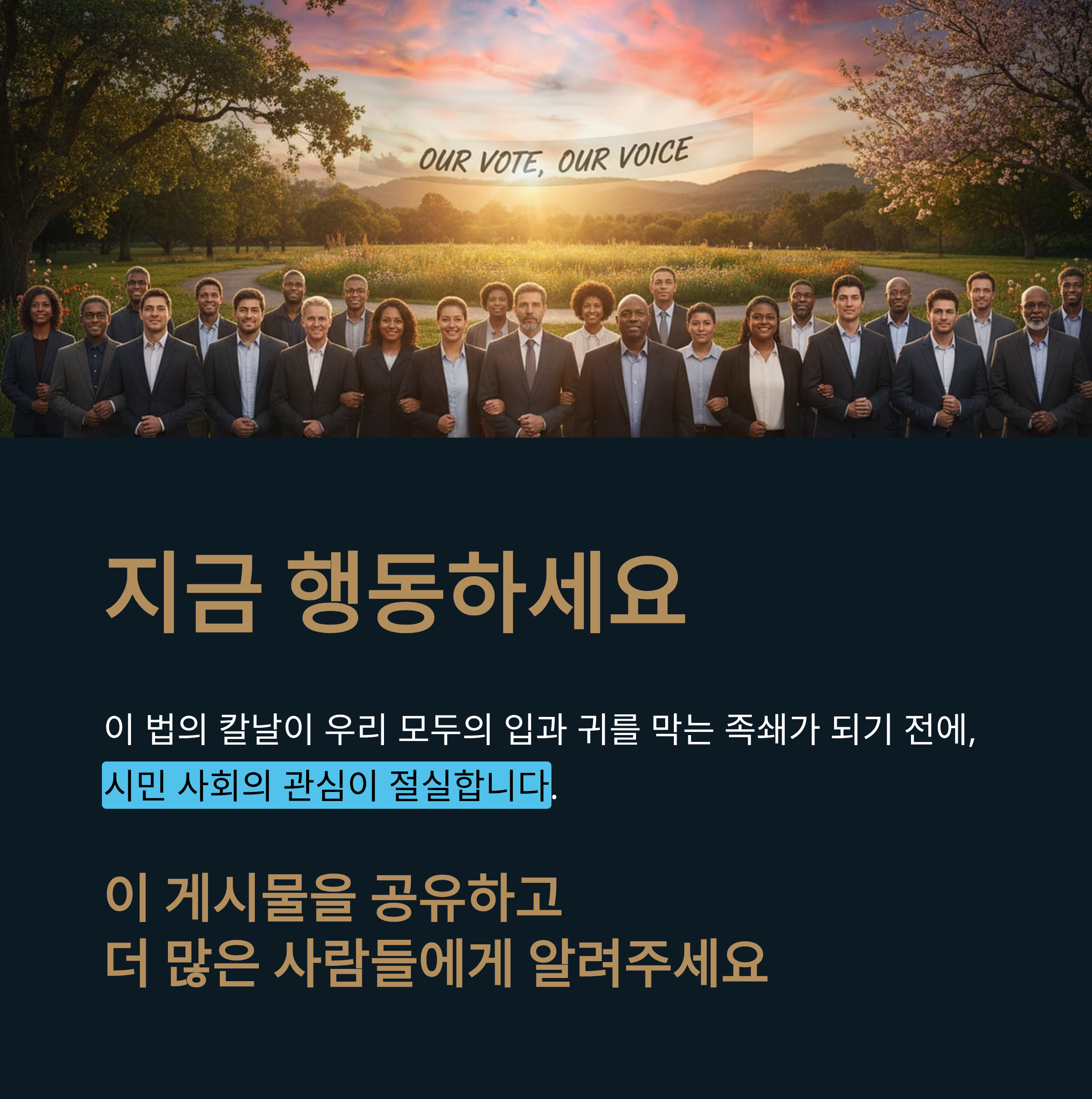 이번 정보통신망법 개정안은 '가짜뉴스 방지'라는 명분 아래 표현의 자유라는 민주주의의 핵심 가치를 심각하게 위협하는 악법이 될 소지가 다분합니다. 동맹국인 미국 국무부가 외교적 결례를 무릅쓰고 직접적이며 강력한 톤으로 비판 성명을 낸 것은 이 법안이 가진 위헌성과 위험성이 국제 사회가 우려할 만큼 심각하다는 방증입니다. ‘허위 정보’에 대한 판단 기준을 권력의 손에 쥐여주는 것은, 펜을 쥔 손에 칼을 쥐여주는 것과 같습니다. 이는 정부와 여당에 비판적인 목소리를 내는 모든 국민과 언론을 위축시키고, 사회 전반에 자기검열의 분위기를 확산시켜 건강한 공론의 장을 파괴할 것입니다.