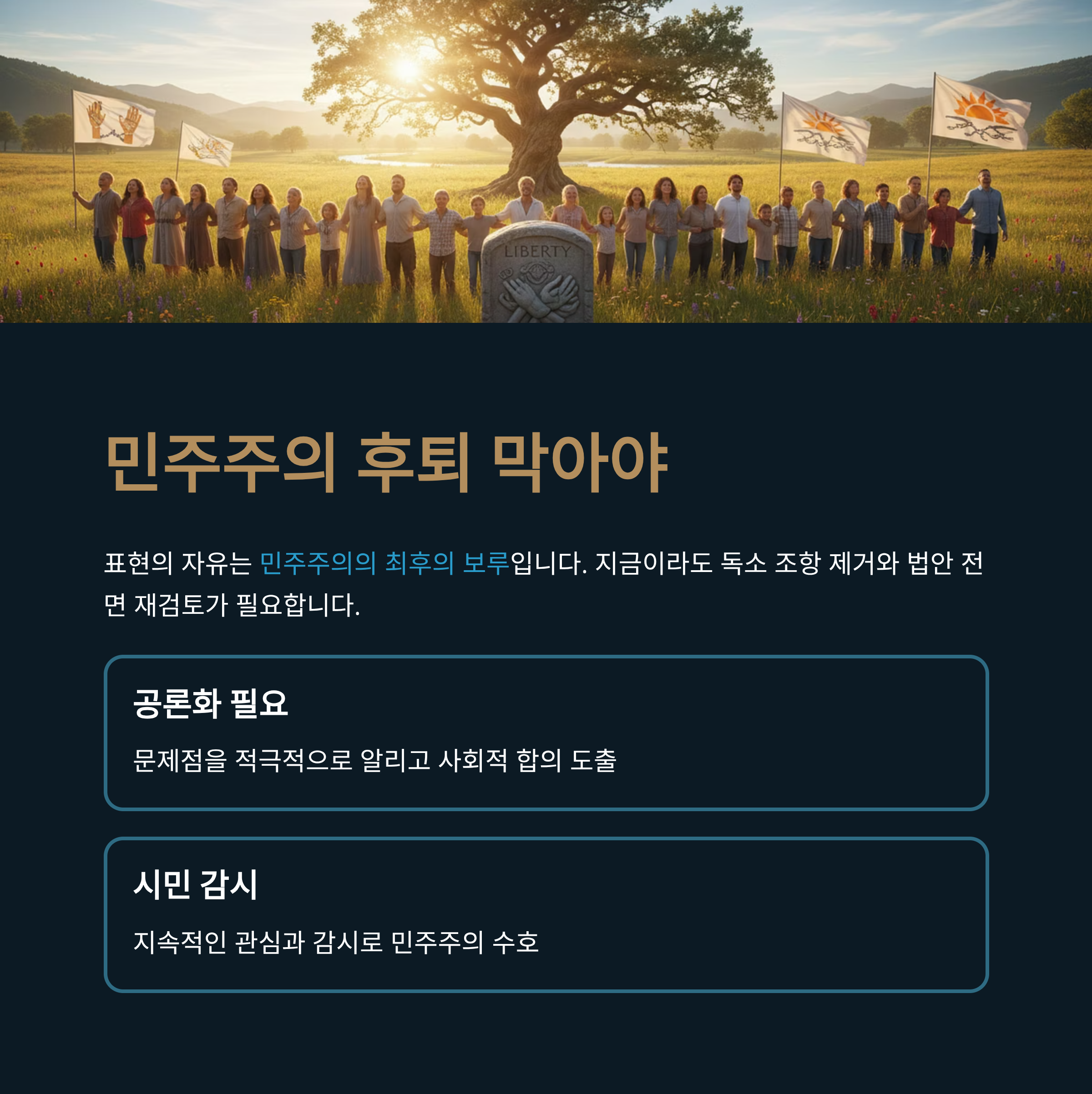 이러한 법은 단순한 법률 조항을 넘어, 사회 전체를 통제하는 강력한 '권력 구조의 문제'로 변질됩니다. 비판적인 여론을 잠재우고, 사회적 논의를 특정 방향으로 유도하기 위한 가장 효과적인 도구가 되기 때문입니다. 민주당이 그간 댓글 여론, 유튜브, 언론 보도 등에 대해 지속적으로 문제 제기를 해왔다는 점을 상기해 보면, 이 법이 가진 잠재적 위험성은 더욱 명확해집니다. 표현의 자유는 문제가 발생한 뒤에 사후적으로 해결할 수 있는 성질의 것이 아닙니다. 한번 무너지면 회복하기 어려운 민주주의의 근간이기에, 법 제정 단계에서부터 그 위험성을 인지하고 사전에 막는 것이 무엇보다 중요합니다. 이 법안이 초래할 '미끄러운 경사길'의 끝에는 통제와 감시가 일상화된 사회가 기다리고 있을지 모릅니다.