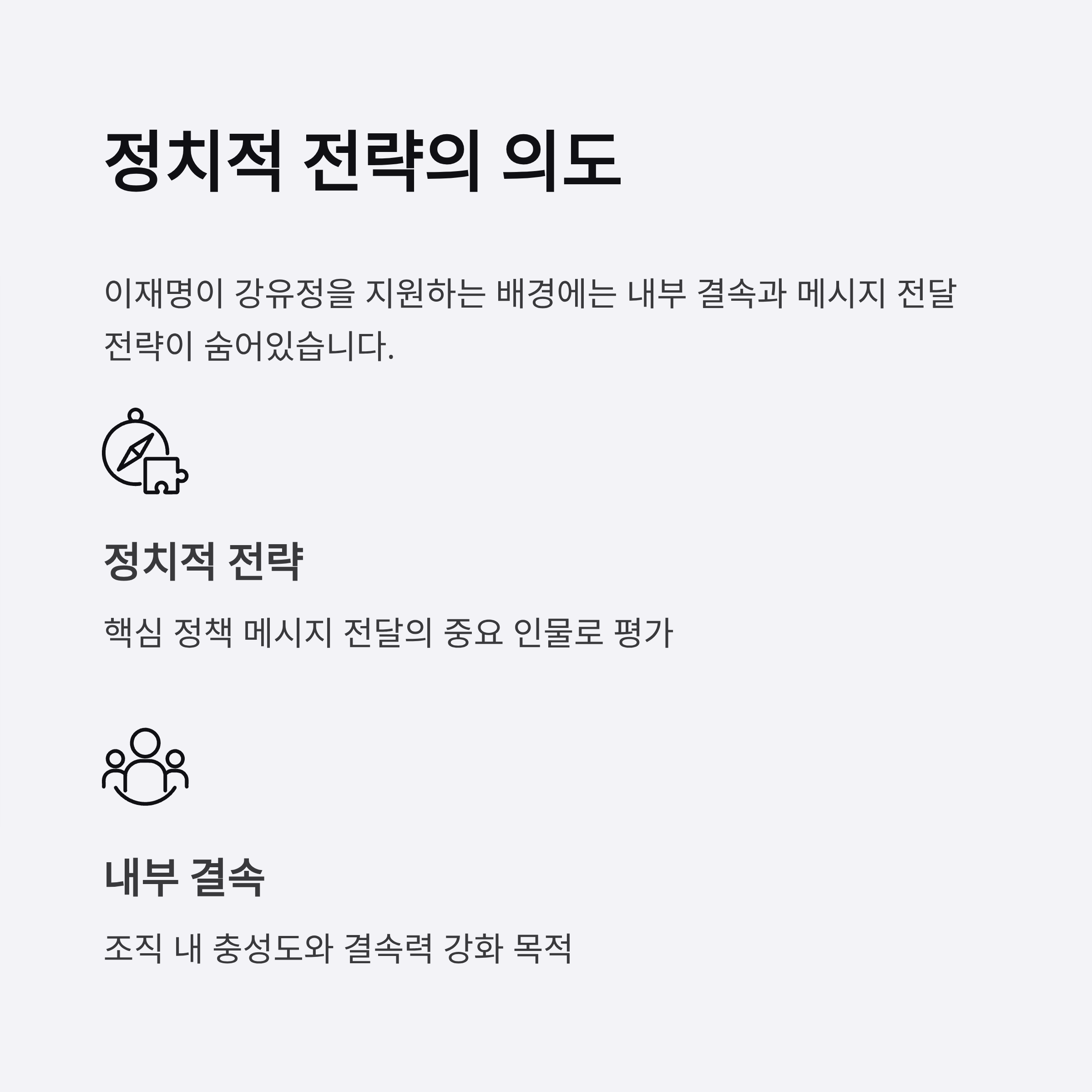 이재명의 결정들은 내부 결속 강화라는 명분과 달리 외부적으로는 불투명한 리더십이라는 비난의 여지를 남기고 있습니다. 강유정과 김현지 문제를 정치적 관점에서만 접근하는 태도는 국민의 신뢰도를 약화시키고 있습니다.