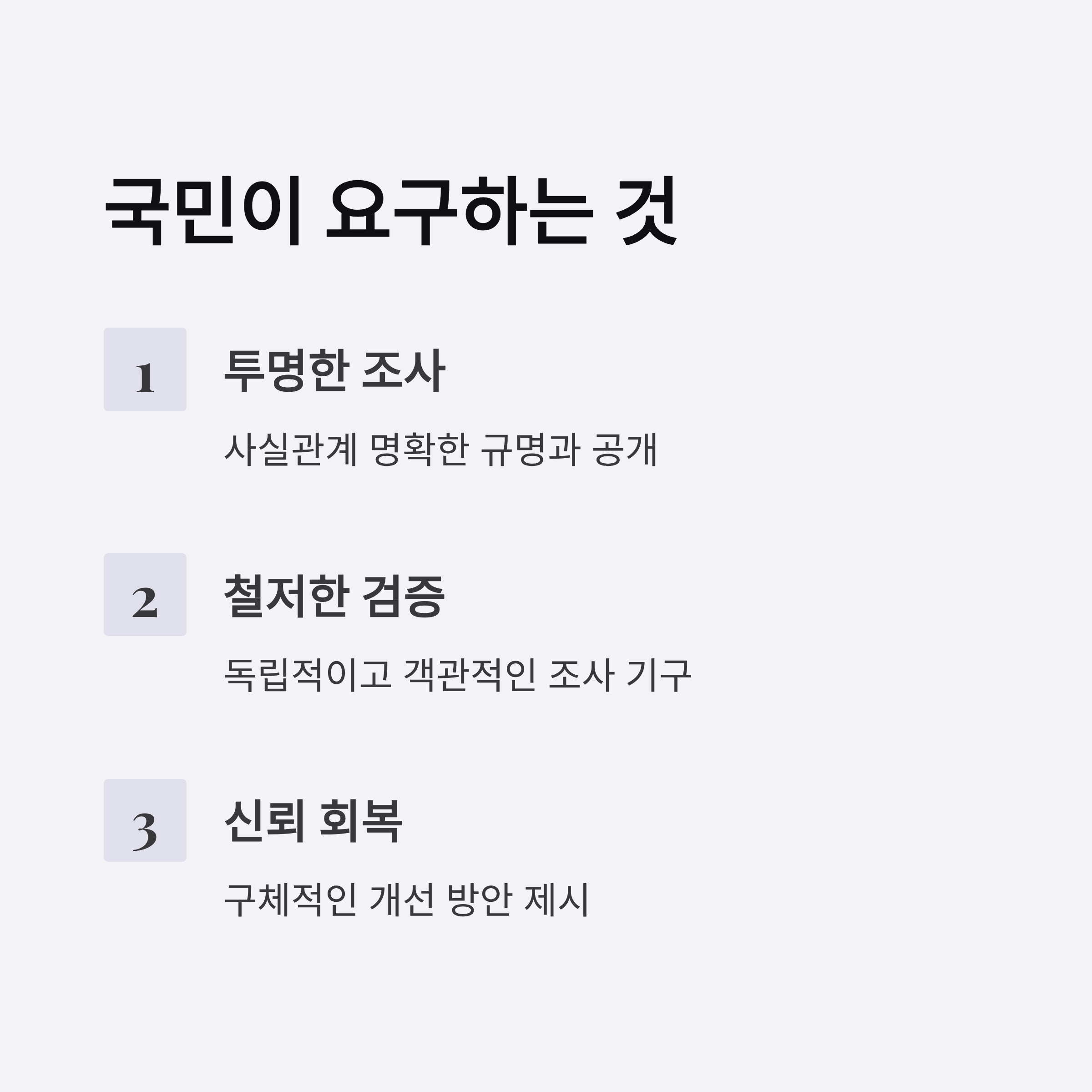 | A. 국민은 이번 사태를 명확히 조사하고 공정하게 판단할 수 있는 별도의 조사팀 구성을 요구해야 합니다. 또한, 특검 및 국정조사를 통해 신뢰 회복을 촉구할 필요가 있습니다. |