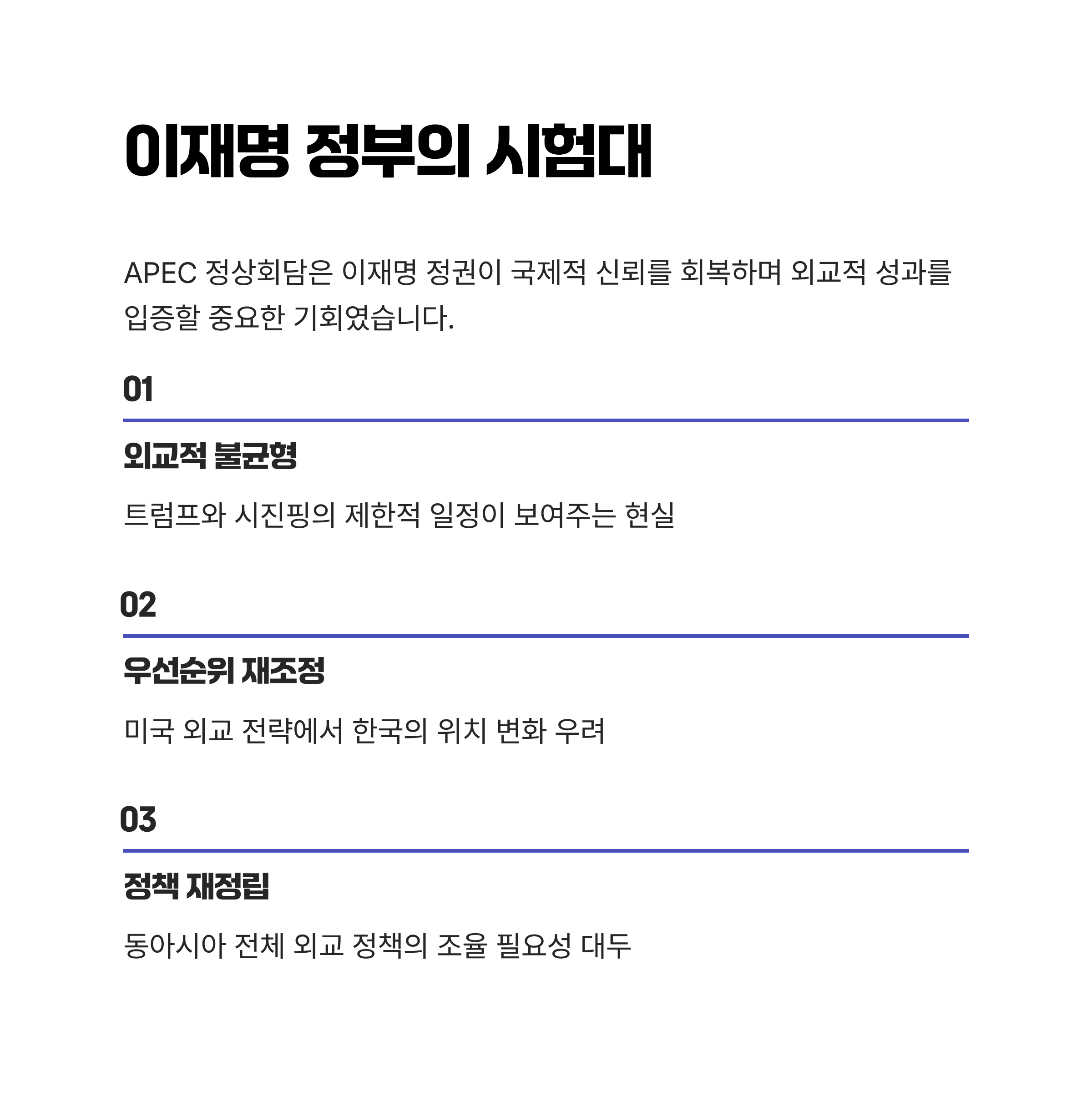 APEC 정상회담은 한국 외교 현주소를 재점검할 중요한 기회였으며, 동시에 이재명 정부가 주요 강대국들에 대해 스마트 외교 전략을 구현해낼 필요성을 강조하게 되었습니다. 트럼프의 실용주의적 외교 기조와 시진핑의 중국 중심적 국제 전략은 한미-한중 관계의 현실을 더욱 복잡하게 만들고 있습니다.