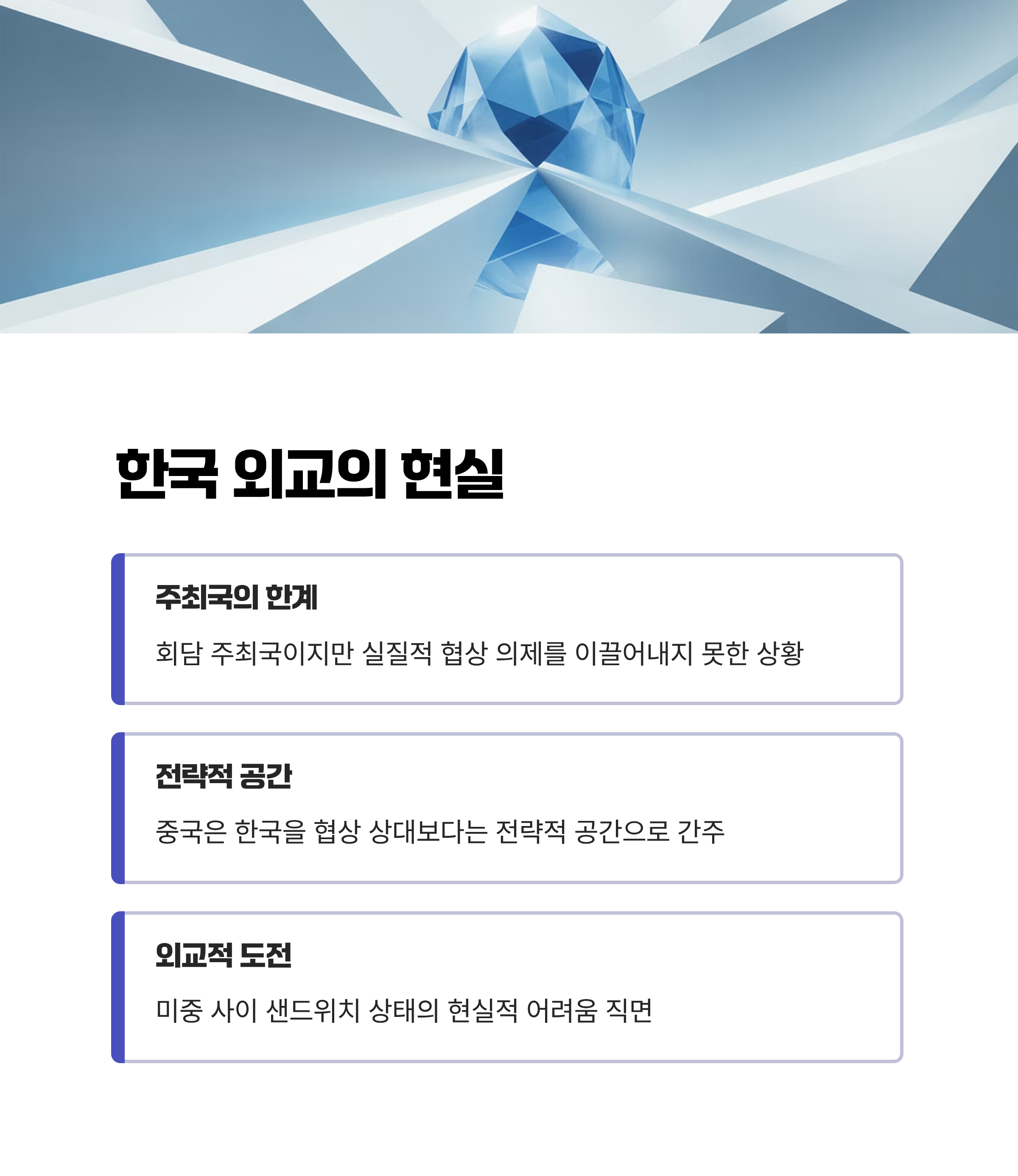 한국은 회담 주최국으로서 중국과 논의의 장을 함께하지만, 실질적으로 큰 협상 의제를 이끌어내지는 못한 상황입니다. 시진핑의 이러한 태도는 한국을 상대보다는 전략적 공간으로 간주하는 중국의 입장을 반영하고 있습니다.