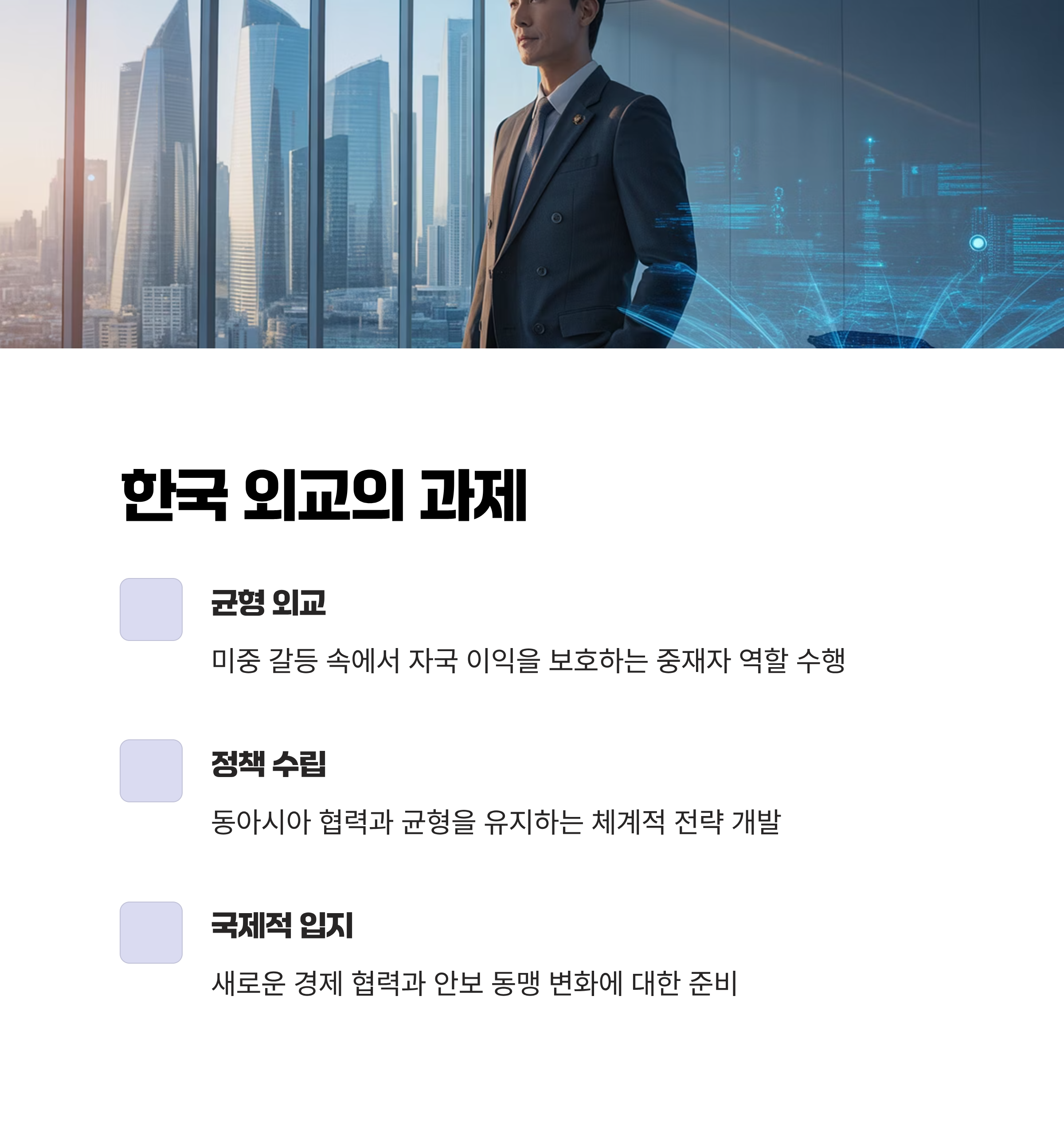 한국 외교는 앞으로도 동아시아 내 협력과 균형을 유지하며, 자국의 국익을 보호할 체계적 정책 수립이 필수적입니다. 새로운 경제 협력과 안보 동맹의 변화를 준비해야 할 시점입니다.