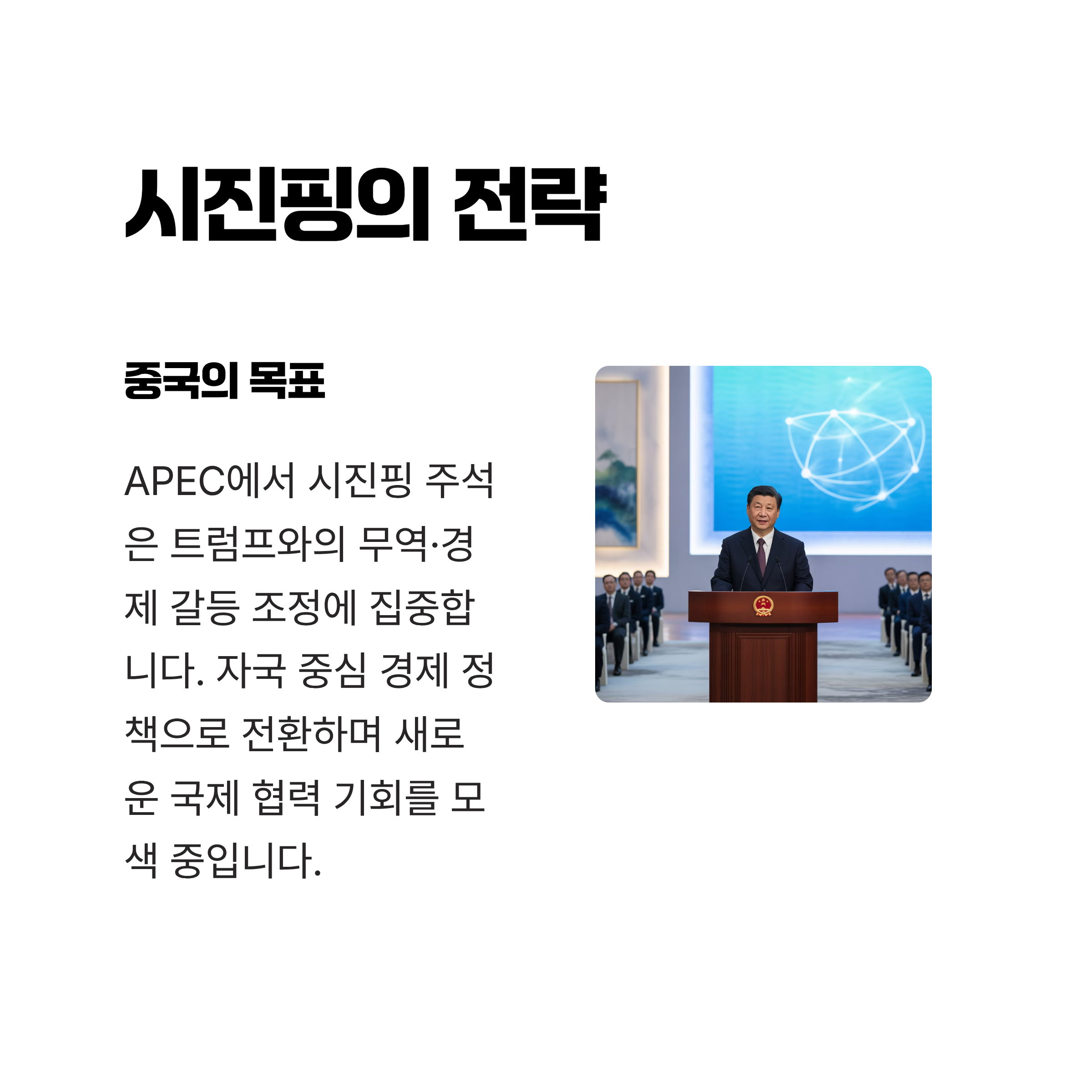APEC 정상회담에서 중국의 시진핑 주석은 한국에서의 체류보다는 자신과 트럼프 사이의 무역 및 경제 갈등을 조정하는 데 중심을 맞추고 있습니다. 이는 중국이 최근 대외 무역 의존도 감소 및 자국 중심의 경제 정책으로 서서히 전환하는 과정에서, 새로운 국제 협력 기회를 노리는 전략임을 시사합니다.