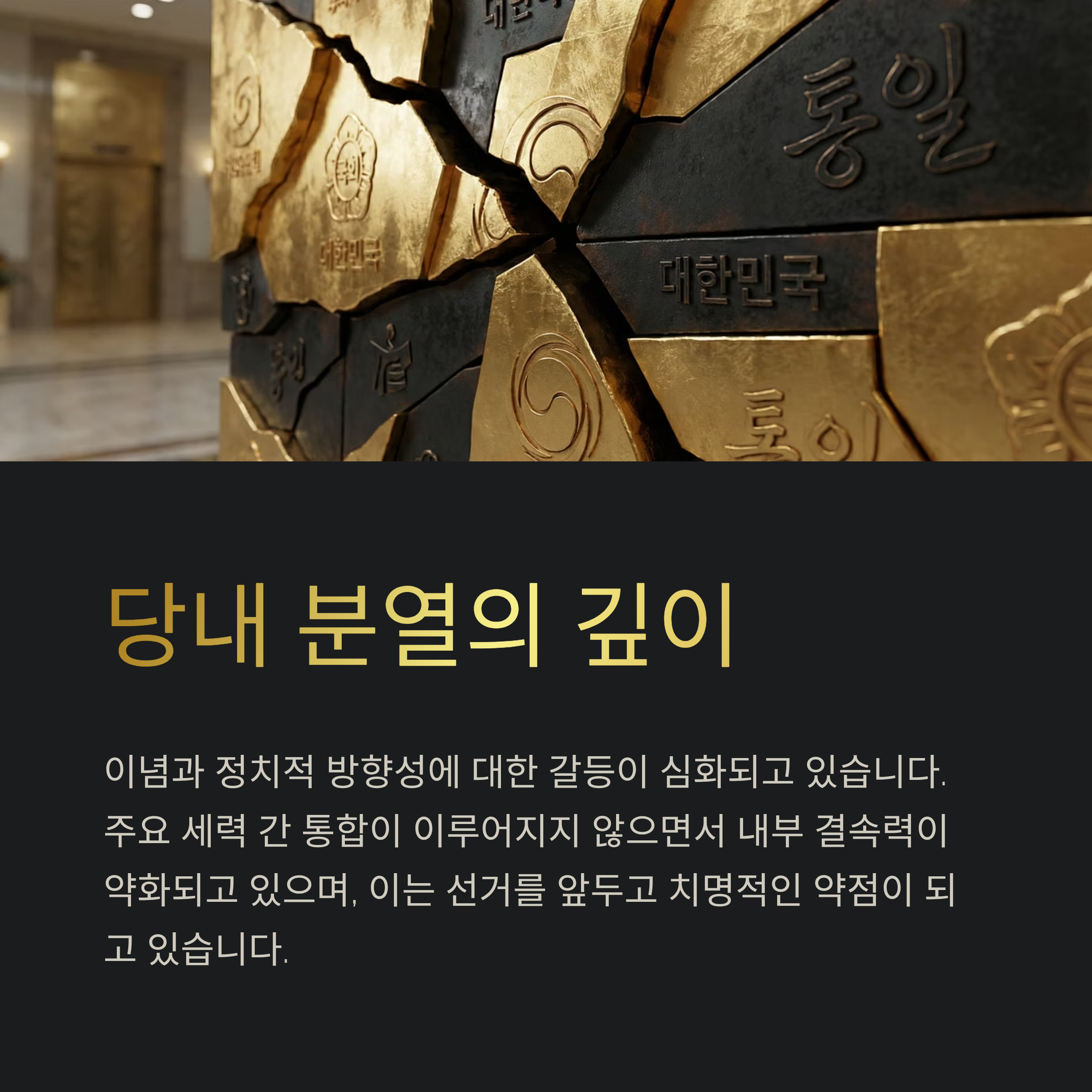 | A. 민심의 분열과 내부 단합 부족은 선거 결과에 부정적인 영향을 미칠 수 있으므로, 이를 해결하기 위한 즉각적인 조치가 필요합니다. |