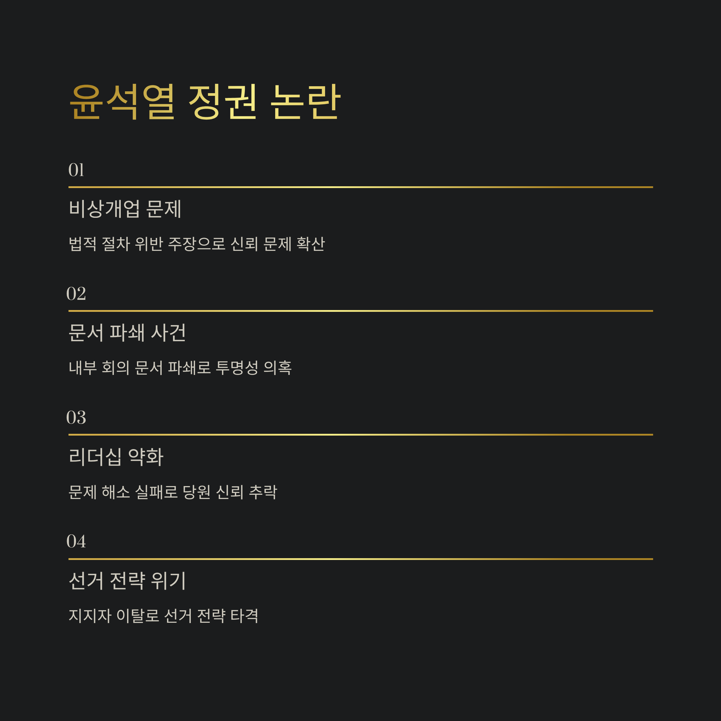 윤석열 전 대통령 시기의 비상개업 및 회의 문서 파쇄 문제는 단지 실수로 치부하기에는 심각한 정치적 함의를 담고 있습니다. 내부 반목의 기저에는 이러한 문제들을 명확히 해소하지 못한 국민의힘 지도부의 현재 리더십 문제가 자리 잡고 있습니다. 이로 인해 당원 및 지지자들에게 당을 대표하는 인물과 정책 자체에 대한 신뢰가 약화되고 있으며, 이는 선거를 앞두고 전략적으로도 치명적인 부분입니다.