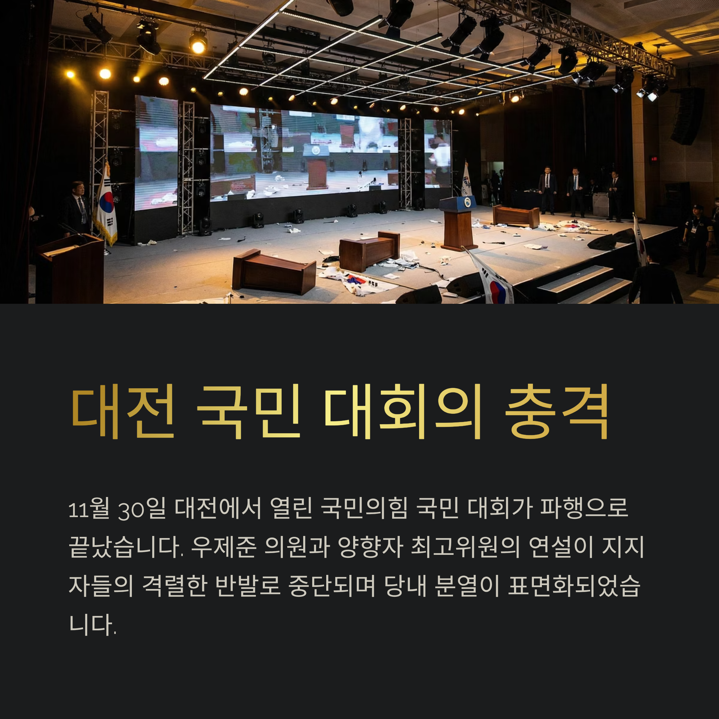 국민의힘이 직면한 이번 대회 파행은 단순히 특정 정치인의 발언이 문제가 된 사건으로 치부하기 어렵습니다. 이는 당 내부의 분열, 민심과 당심 간의 괴리, 정책 결정 과정에서의 신뢰 부족이라는 복합적인 문제가 결부된 사건입니다. 앞으로 국민의힘은 국민과 당원 모두가 공감할 수 있는 새로운 비전을 제시하고, 민심을 충족할 수 있는 방향으로 변화해야 합니다. 그렇지 않다면, 내부 혼란과 민심 이탈은 더욱 심화될 것입니다. 국민의 기대에 부응하고자 한다면, 무엇보다 투명성과 책임 있는 리더십이 중요합니다. 이를 기반으로 단합된 방향성을 보여주는 노력이 국민과 당원 모두의 신뢰를 다시 얻는 데 크게 기여할 것입니다.
