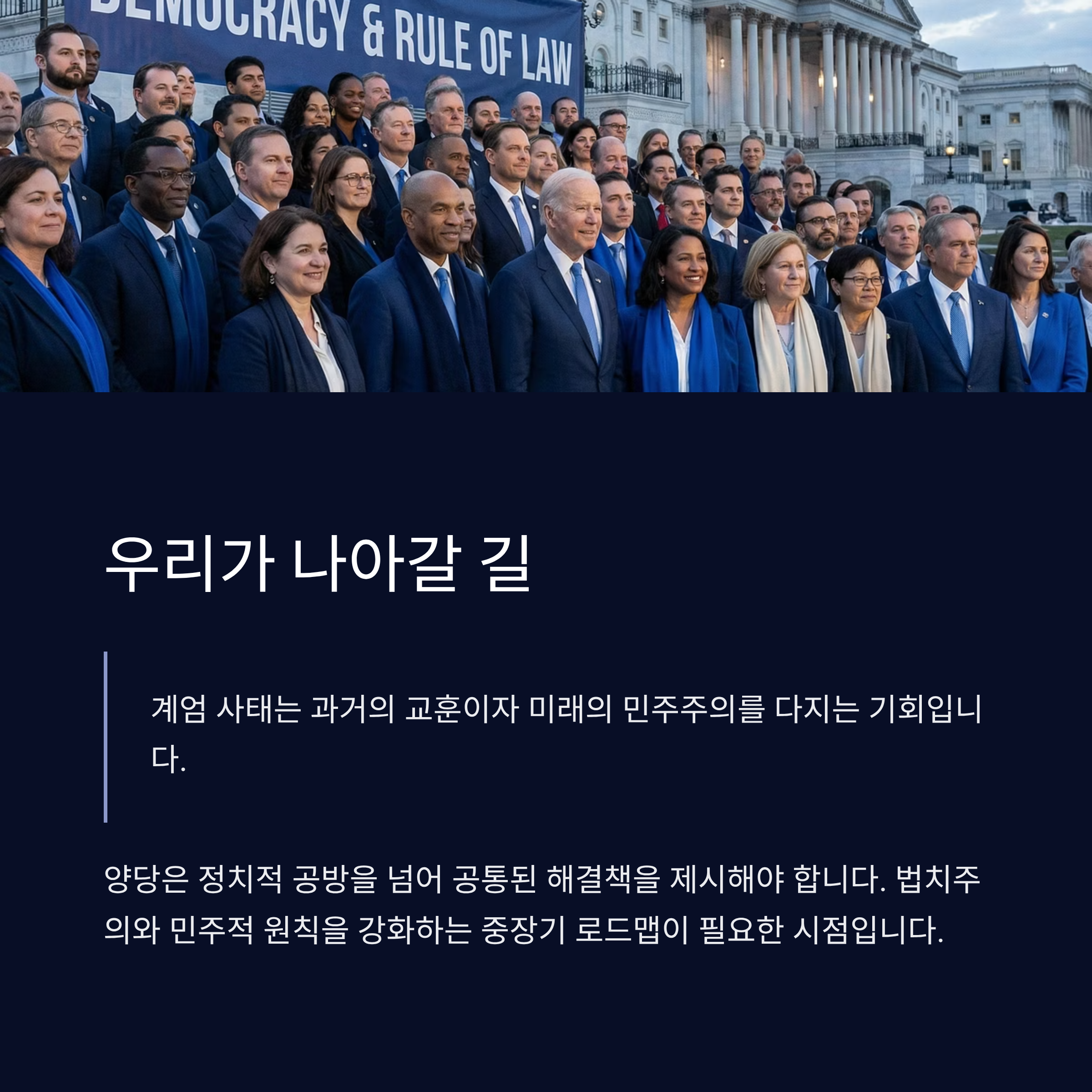 계엄 사태는 과거의 비극적 사건을 기억하며 동시에 미래의 민주주의를 굳건히 다지기 위한 교훈의 기회로 작용할 수 있습니다. 그러나 현 시점에서 여야의 대응은 사건의 본질을 단순히 정치적 공방껀으로 만드는 데 그치고 있습니다. 국민적 통합과 민주 열망에 부응하려면 계엄 사태를 둘러싼 진실 규명과 법적 책임 정리가 필요한 시점입니다. 양당은 대립을 넘어 공통된, 실효성 있는 해결책을 마련함으로써 갈등의 선순환 구조를 제시해야 합니다. 또한, 국가적 신뢰 회복을 위해 법치주의와 민주적 원칙을 강화하는 중장기적 로드맵을 제출할 필요가 있습니다.