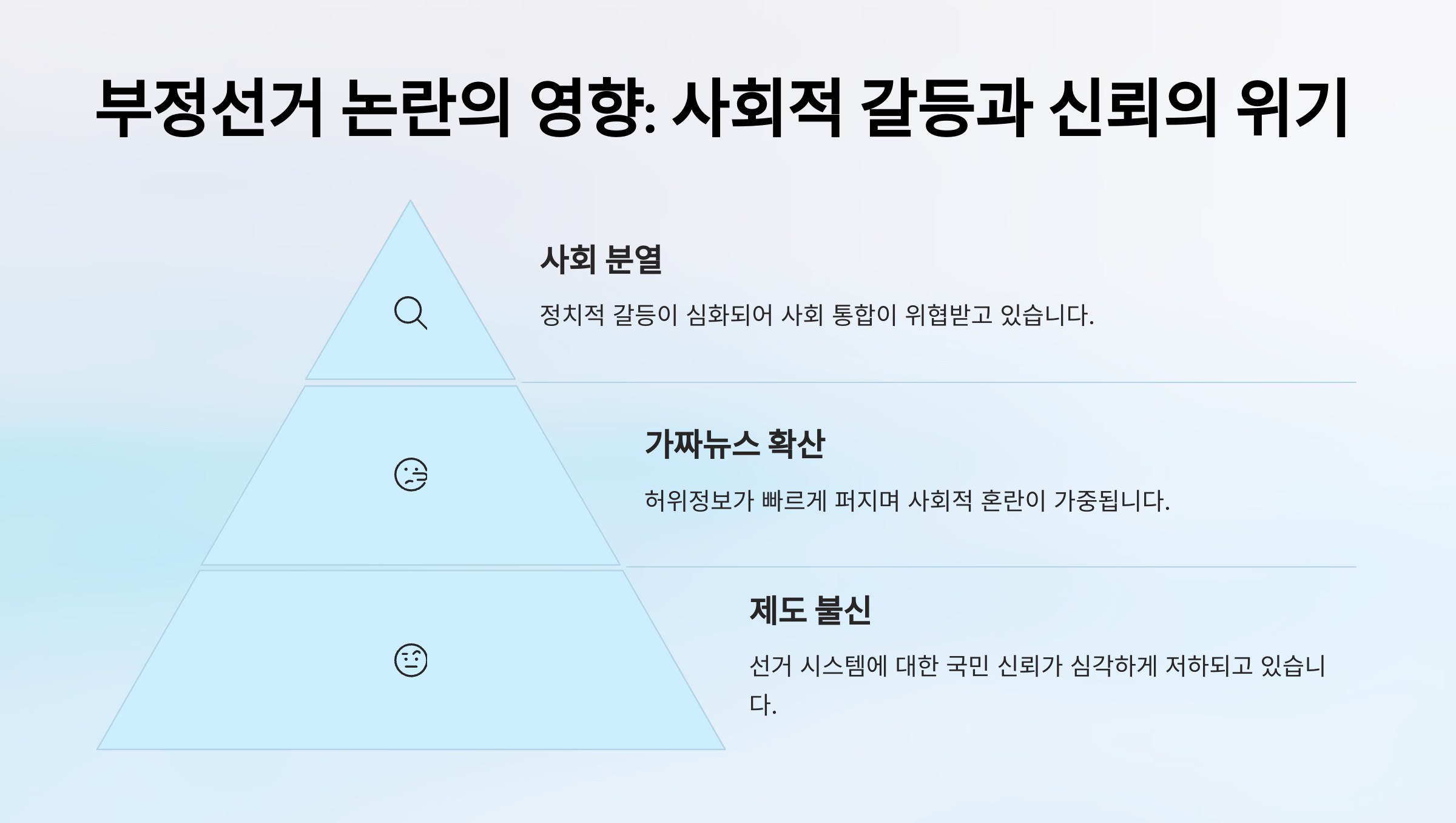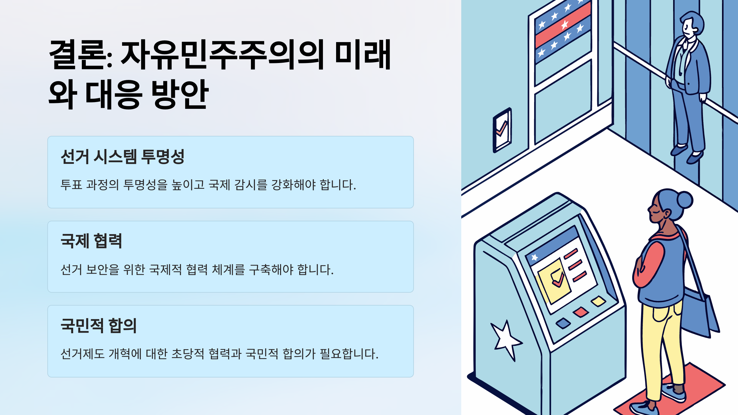 한국이 베네수엘라처럼 체제 불신과 선거 조작 논란 속에 민주주의가 약화되는 길로 접어들지 않기 위해서는, 선거 투명성 제고와 철저한 검증 시스템이 필요합니다. 또한 정치권 전반의 공정성 회복과, 유권자 교육을 통한 선거 주권의 회복이 절실합니다. 국민이 신뢰할 수 있는 제도 위에서 민주주의가 작동하도록 만드는 것이 지금 가장 시급한 과제입니다.