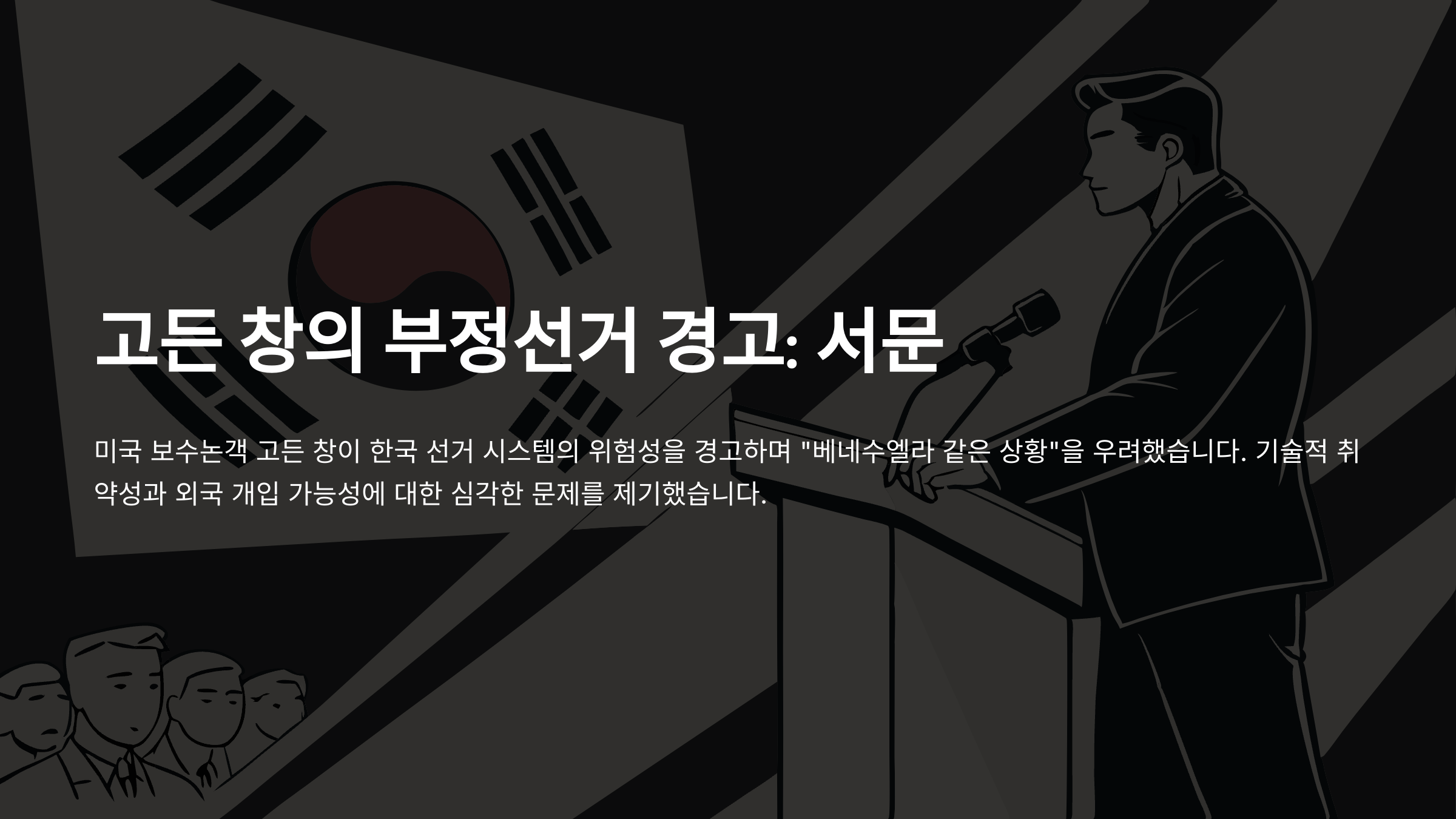 미국 보수논객 고든 창은 최근 한국 선거 시스템에 대해 강한 의혹을 제기하며, “한국이 베네수엘라처럼 될 수 있다”고 발언했습니다. 그는 2020, 2022, 2024년의 선거 결과가 여론조사와 심각하게 괴리되어 있으며, 이는 통계적으로 설명이 불가능하다고 지적했습니다. 그 원인으로는 조기 투표 시스템의 기술적 취약성과 중국 화웨이 서버의 개입 가능성을 들고 있습니다.
