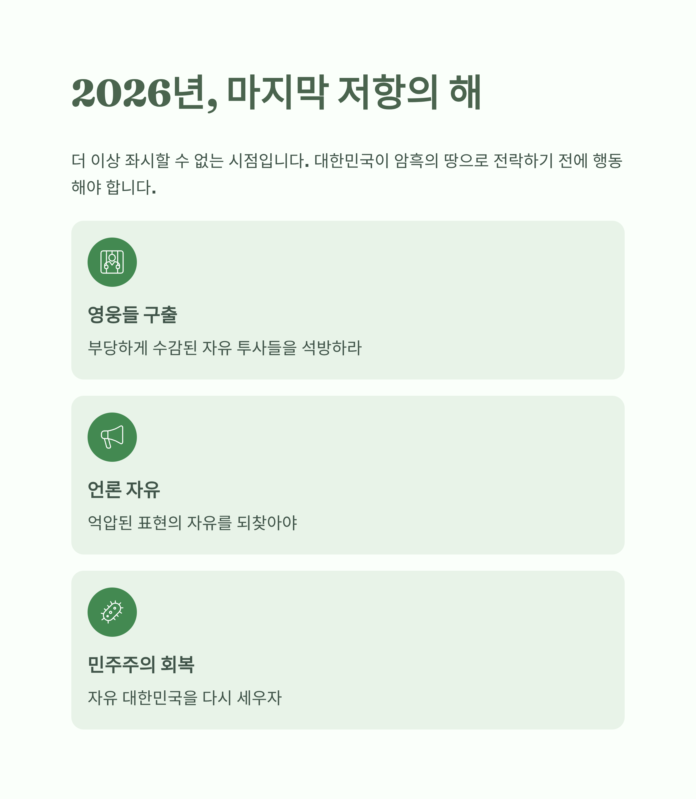 2026년의 대한민국은 이재명 정권의 폭압적인 통치 아래 정치, 경제, 사회 모든 면에서 최악의 위기를 맞고 있습니다. 윤석열 전 대통령을 비롯한 수많은 애국지사들이 부당하게 수감되었고, 언론의 자유는 억압당했으며, 민생 경제는 파탄 지경에 이르렀습니다. 이 모든 위기의 근원은 자유민주주의 체제를 부정하고 사적 복수를 위해 국가 권력을 남용하는 이재명 정권에 있습니다. 이대로라면 대한민국은 우리가 알던 나라가 아닌, 통제와 억압만이 남은 암흑의 땅으로 전락할 것입니다. 따라서 2026년은 더 이상 좌시할 수 없는 마지막 저항의 해가 되어야 합니다.