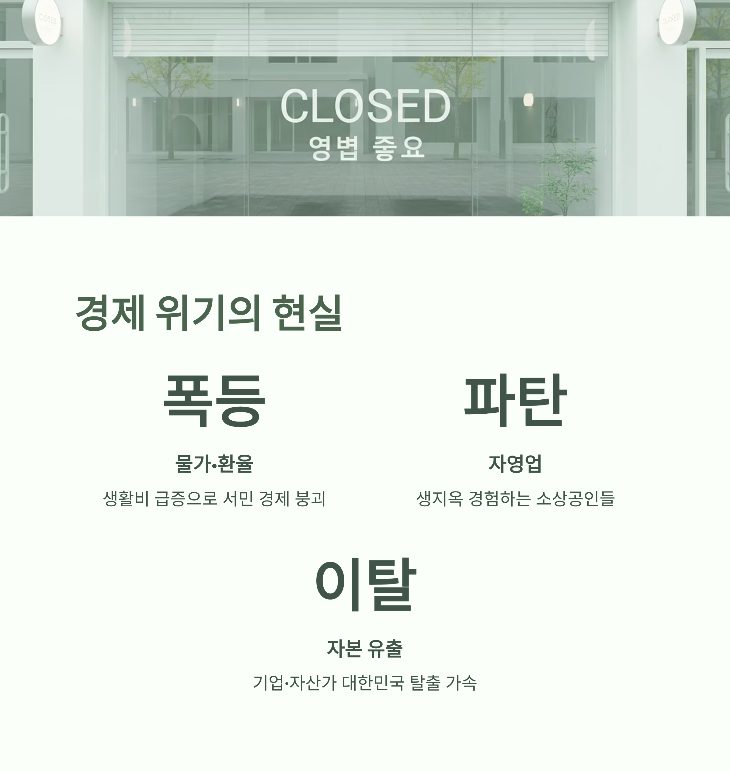 | 경제 위기 | 물가 및 환율 폭등, 자영업자 붕괴, 기업 및 자본의 해외 이탈 가속화로 총체적 경제 위기 봉착. |