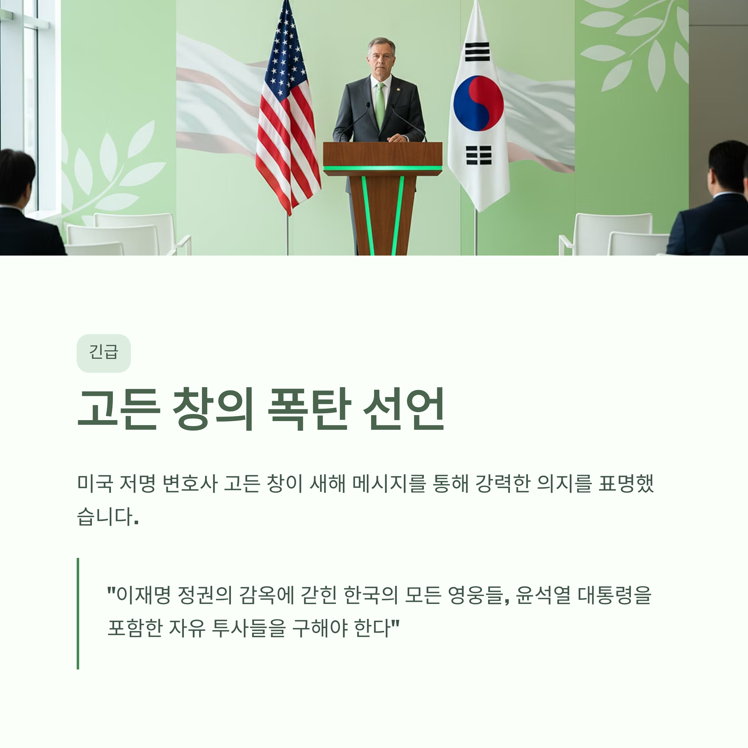 고든 창 폭탄 선언 "새해 윤을 포함해 한국의 영웅들을 석방할 것이다" (2026.1.1)