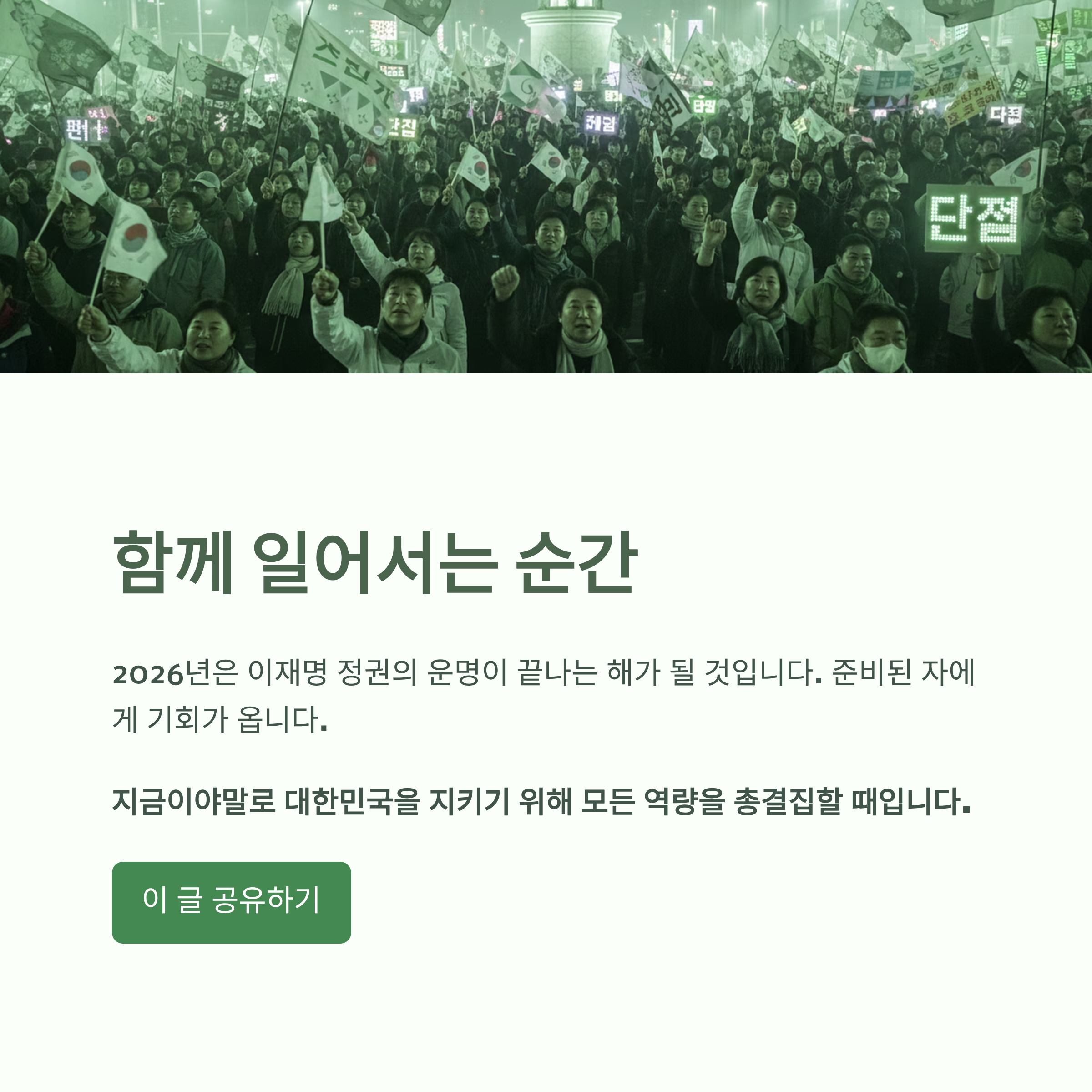 2026년은 이재명 정권의 운명이 끝나는 해가 될 것이라는 전망도 있습니다. 그러나 준비되지 않은 자에게 기회는 오지 않습니다. 경제 폭망과 민심 이반은 정권 붕괴의 기폭제가 될 수 있지만, 이를 자유민주주의 회복의 에너지로 전환하는 것은 오롯이 우리 국민의 몫입니다. 지금이야말로 대한민국을 마지막 순간까지 지키고 보호하기 위해 모든 역량을 총결집해야 할 때입니다. 2026년 새해, 절망 속에서도 희망의 불씨를 살려 이재명을 끌어내고, 갇힌 영웅들을 구출하며, 위대한 자유 대한민국을 되찾는 위대한 투쟁의 서막을 함께 열어갑시다.
