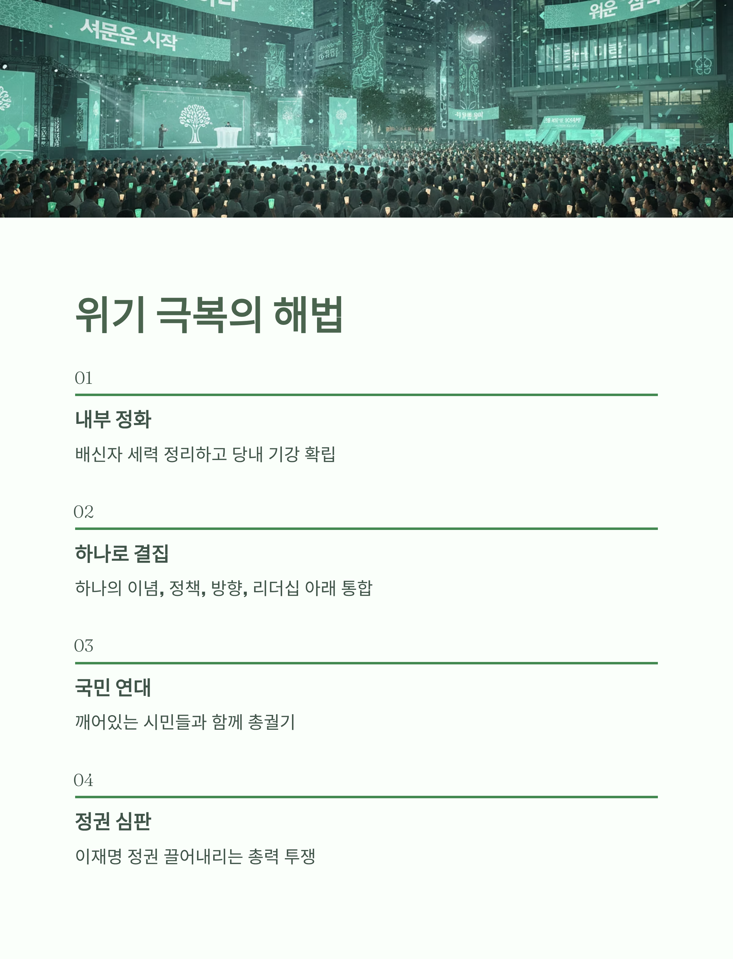 진정한 위기 극복은 내부의 적을 정리하는 것에서부터 시작되어야 합니다. 국민의힘은 조속히 당내 배신자들과 반란 세력을 수술하여 몰아내야 합니다. 이후 '하나의 이념, 하나의 정책, 하나의 방향, 하나의 리더십' 아래 똘똘 뭉쳐야만 비로소 거대한 이재명 정권과 맞서 싸울 수 있는 힘을 갖추게 될 것입니다. 현재 대한민국은 경제 폭망, 민생 파탄의 위기에 직면해 있습니다. 물가와 환율이 폭등하고 자영업자들은 생지옥을 경험하고 있으며, 기업과 자산가들은 앞다투어 대한민국을 떠나고 있습니다. 이러한 총체적 위기 상황에서 야당이 내부 분열로 시간을 허비하는 것은 국민에 대한 배신 행위입니다. 당의 기강을 바로 세우고 외부의 지지 세력과 연대하여 강력한 대여 투쟁에 나서는 것만이 유일한 해법입니다.