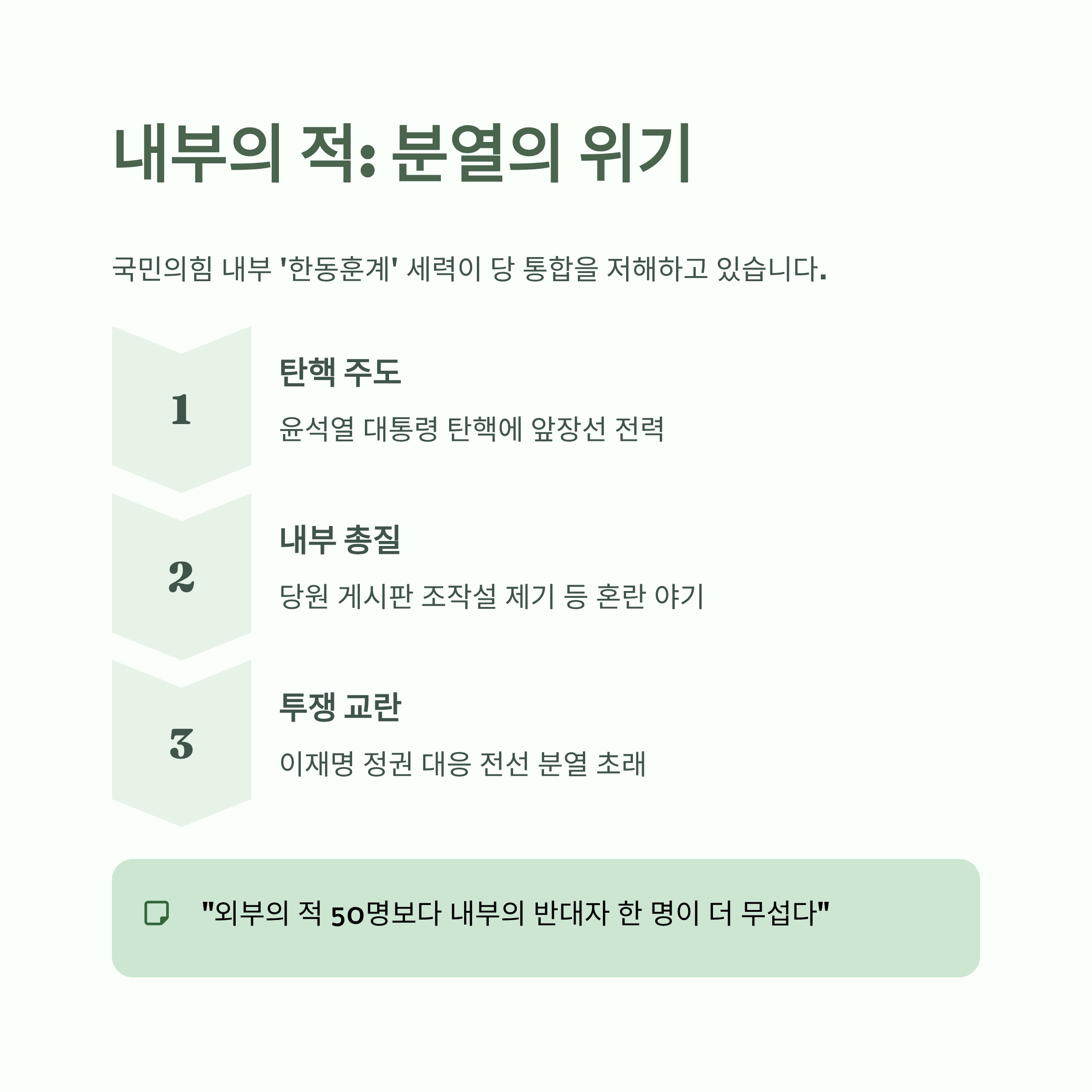 | 야당 내부 분열 | 국민의힘 내부 '한동훈계'가 당 통합을 저해하는 '내부의 적'으로 지목되며 효과적 투쟁을 방해. |
