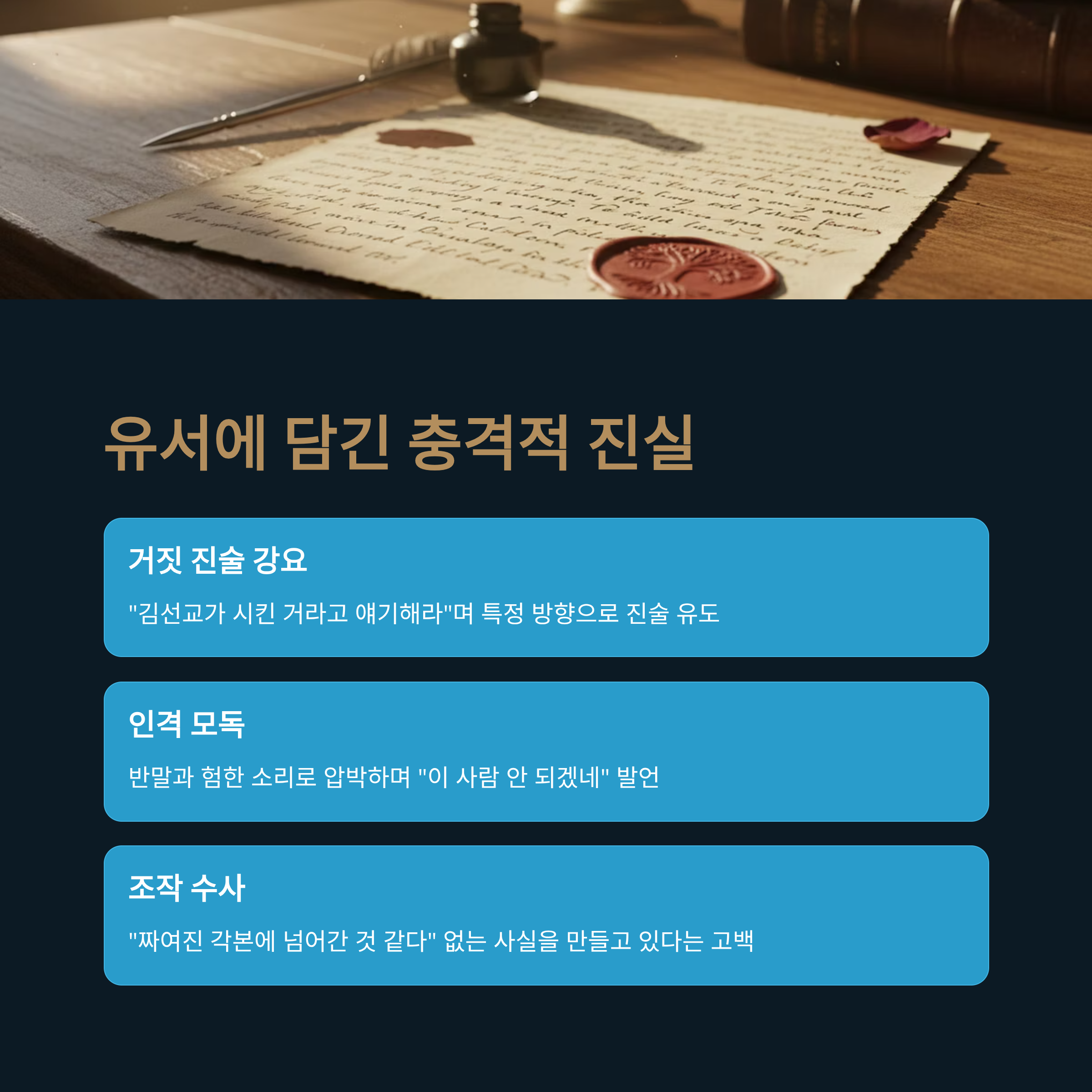 유서에는 "특검의 타겟은 김선교니까 그가 시킨 거라고 얘기해라"라며 특정 방향으로 진술을 유도하고 강요한 내용이 명시되어 있습니다.