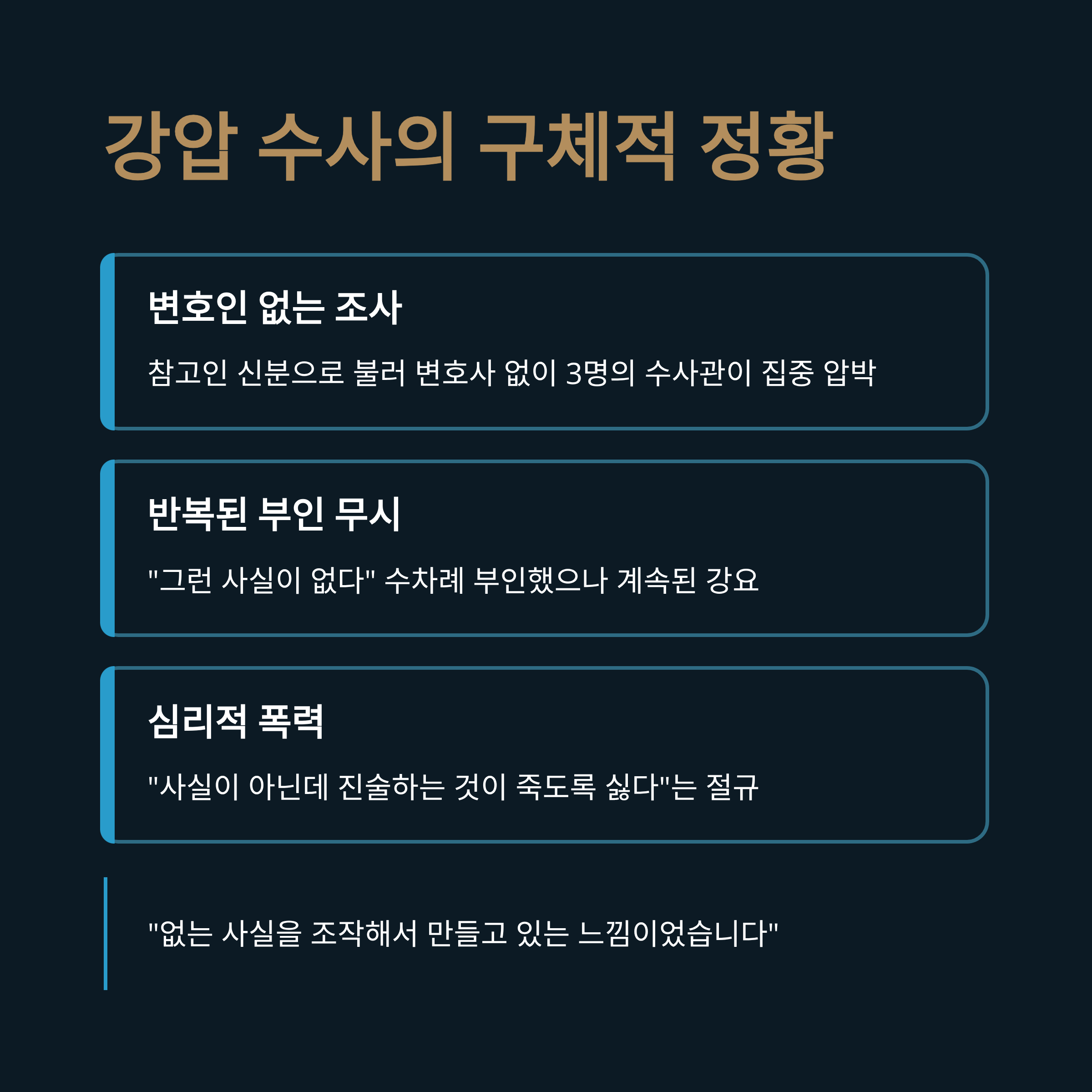 이는 피의자의 방어권을 무시하고, 원하는 답을 얻기 위해 심리적, 언어적 폭력을 가한 명백한 강압 수사의 정황입니다.