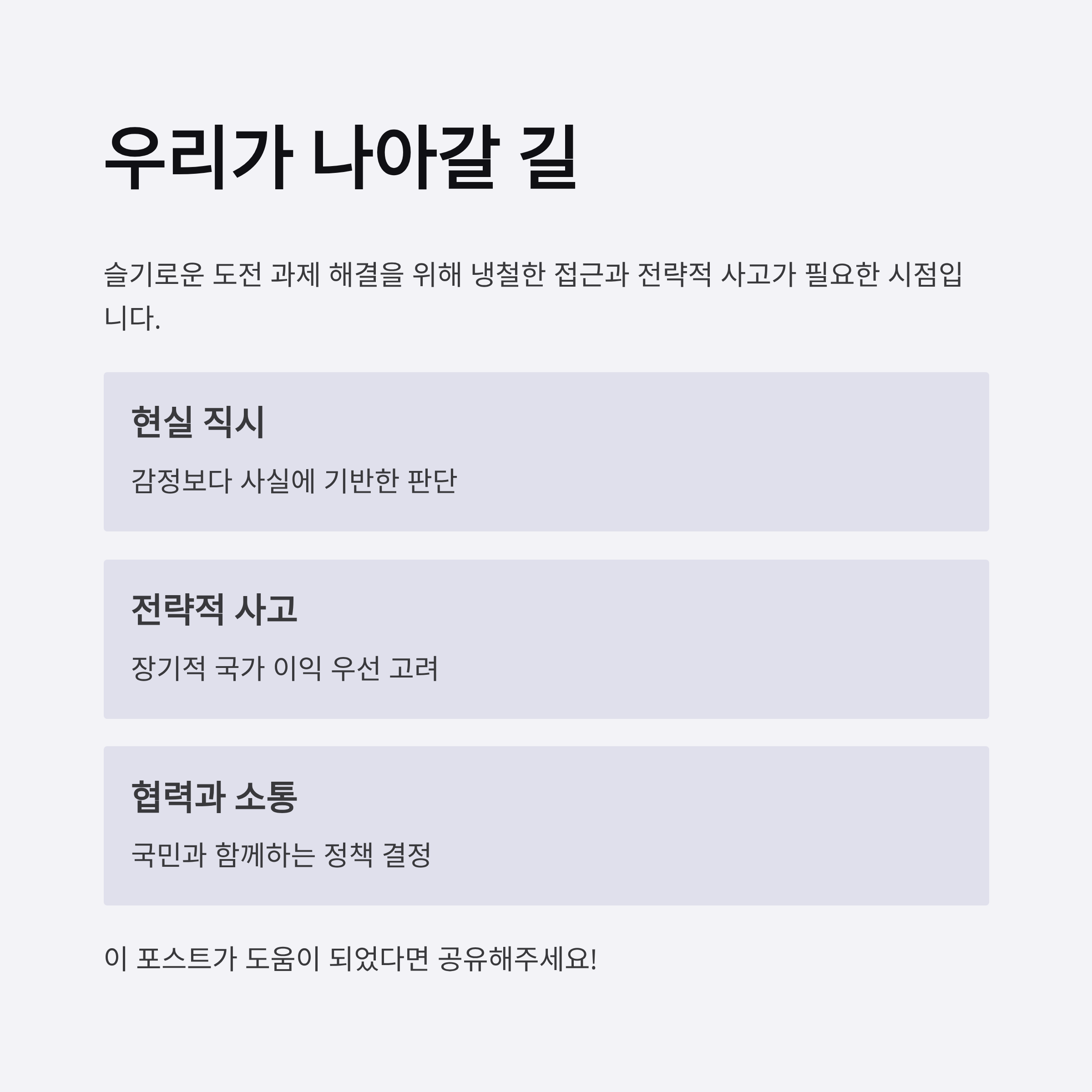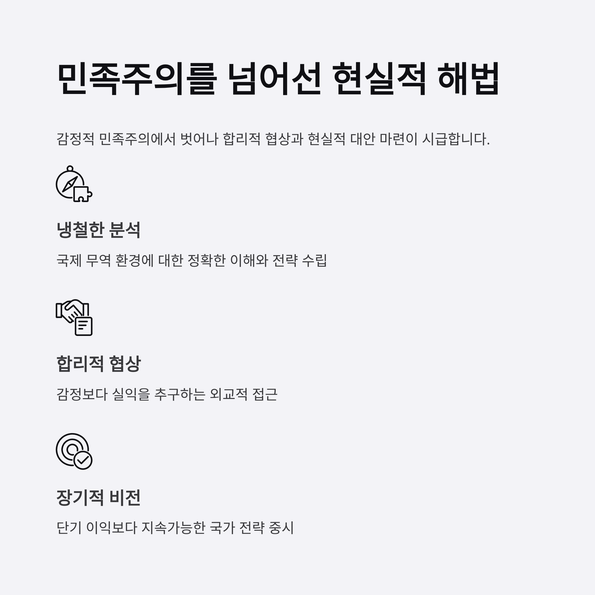 5. 이번 사안을 계기로, 민족주의적 충동에서 벗어나 현실적인 외교 및 경제적 대안을 마련해야 한다는 목소리가 커지고 있습니다.