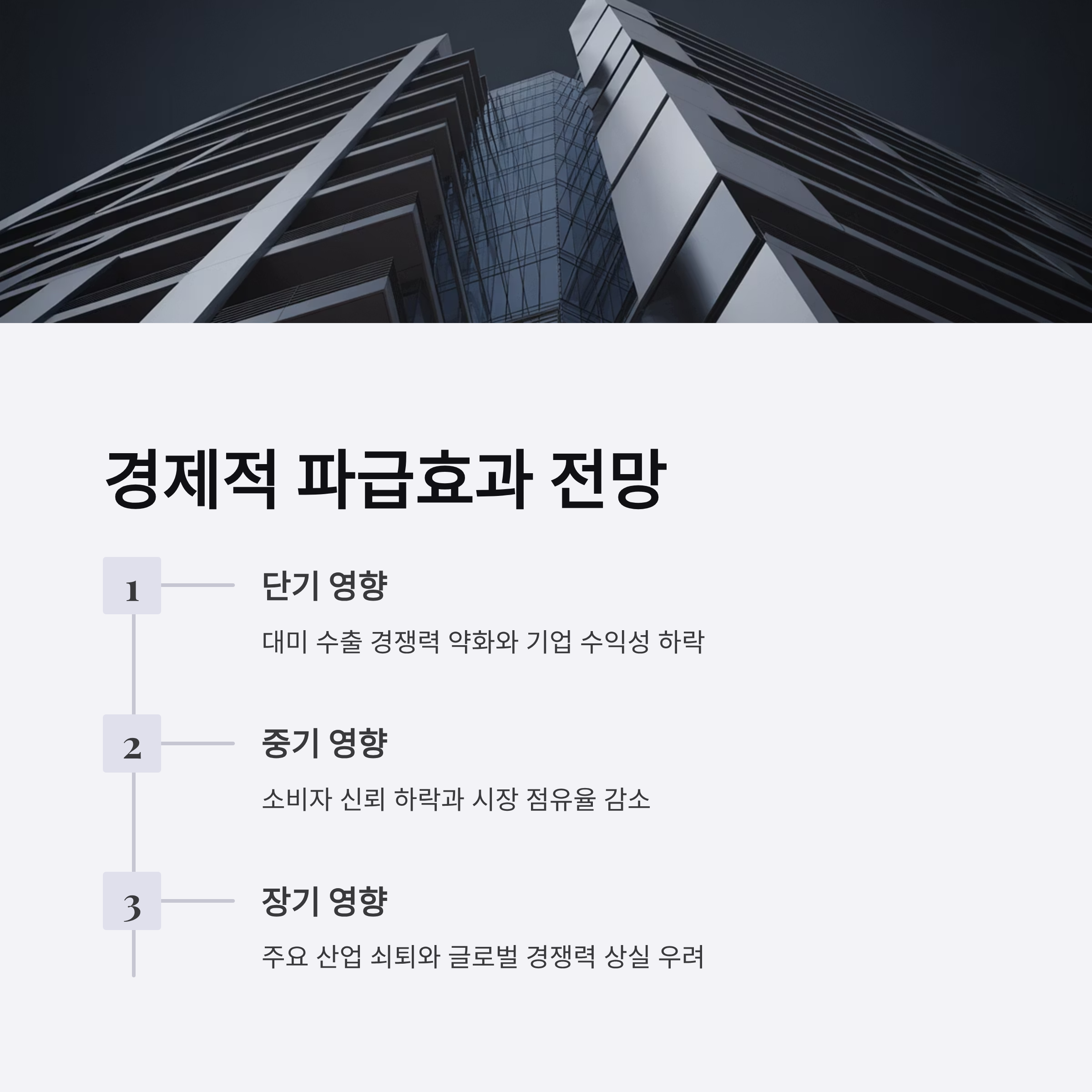 A. 관세 문제로 인해 대미 수출경쟁력 약화, 소비자 신뢰 하락, 주요 산업 쇠퇴 등이 우려됩니다. 이는 한국 산업의 글로벌 경쟁력에도 부정적 영향을 미칠 것입니다. |