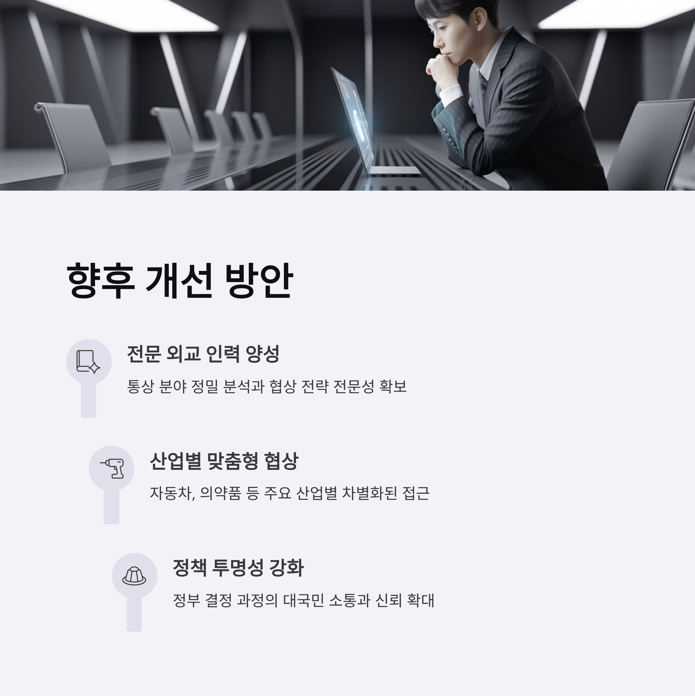 한국의 관세협상은 단순히 경제적 이익이나 외교적 실패에 그치는 것이 아니라, 우리 국가 전체적인 전략과 리더십 부족의 사례로 해석될 수 있습니다. 감정적 민족주의에서 벗어나 현실적 해법을 찾고 국제 사회 내에서 합리적 협상을 이끄는 데 집중해야 합니다. 향후 국가 차원에서는 다음과 같은 개선점에 초점을 맞추는 것이 바람직합니다: 1. 전문 외교 인력 양성: 외교 및 통상 분야에서 정밀 분석과 협상 전략을 수립할 수 있는 전문성을 확보. 2. 산업별 맞춤형 협상: 자동차, 의약품 등 주요 산업별로 차별화된 접근법 적용. 3. 정책 투명성 강화: 정부 결정 과정에서 대국민 소통과 신뢰를 확대. 우리에게 주어진 도전 과제를 슬기롭게 풀어갈 수 있도록 냉철한 접근과 전략적 사고가 필요합니다.