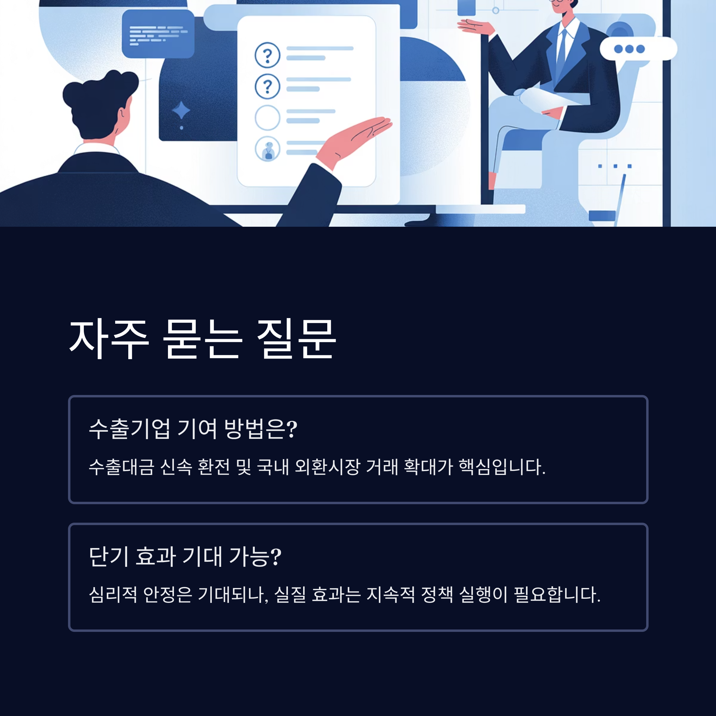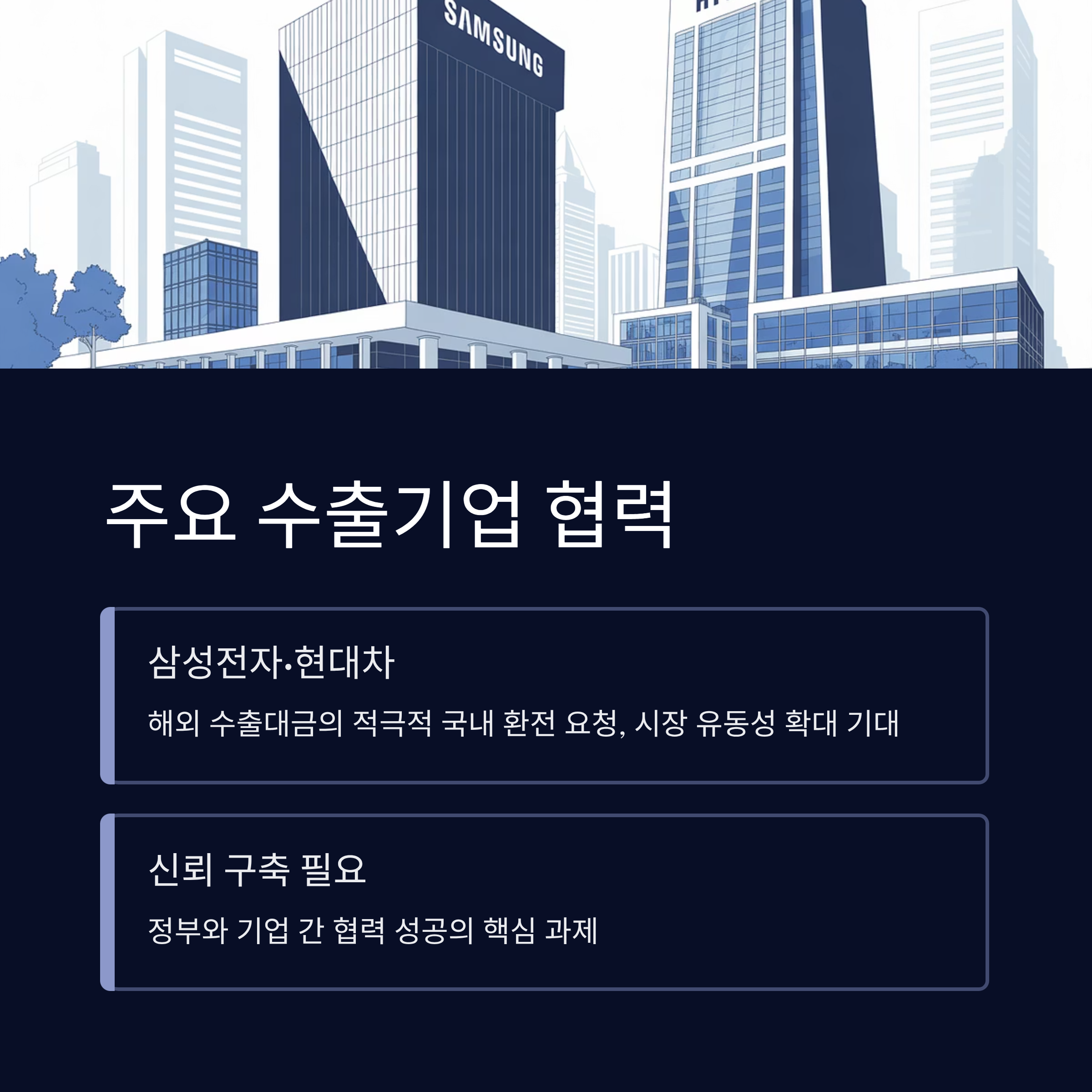 정부는 삼성전자, 현대차 등을 비롯한 주요 수출기업과 협력하여 해외에서 벌어들인 달러를 보다 적극적으로 국내로 환전하도록 요청했다. 이는 시장 유동성을 확장시키고 실질적인 외환 부족을 완화하기 위한 전략이기도 하다. 수출기업이 외환시장에 참여를 확대하면 단기간에 환율 안정에 기여할 수 있다는 전망이 있다. 단, 이러한 협력이 성공적으로 이루어지기 위해선 수출기업과 정부 간의 신뢰 구축이 선결 과제이다.