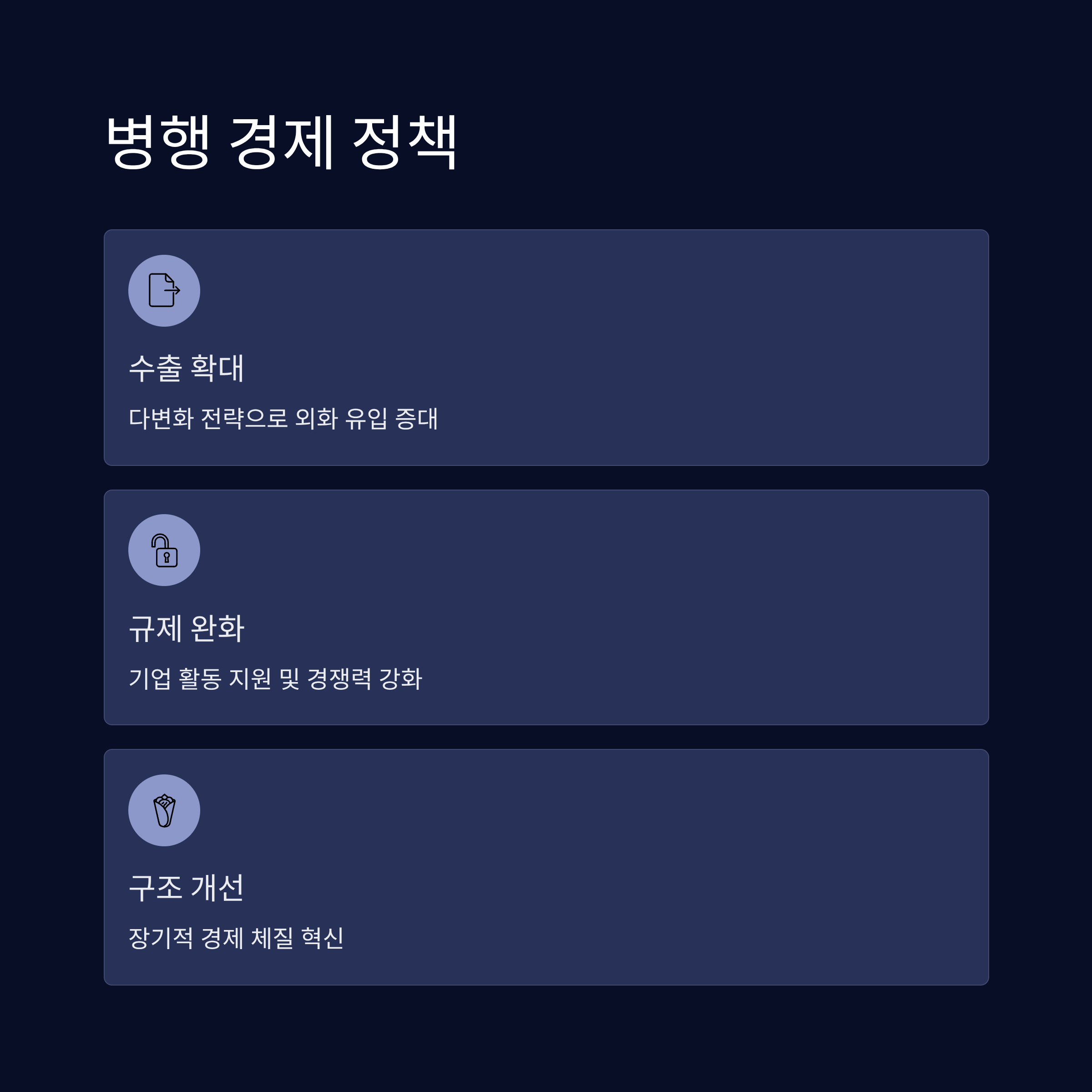 4. 경제 정책 병행으로 수출 확대 및 다변화, 규제 완화를 동시에 추진하고 있습니다.