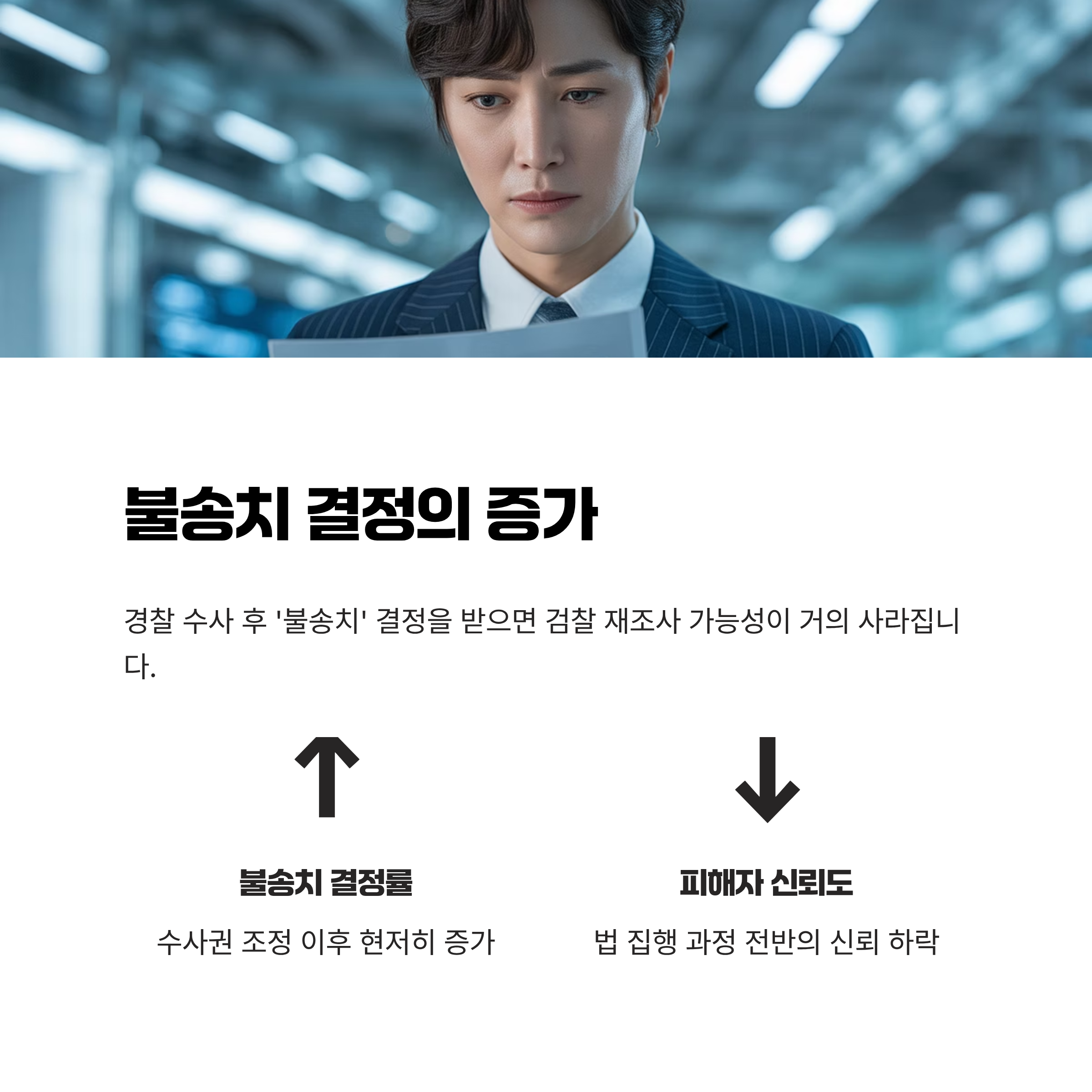 피해자들이 경찰 수사 후 '불송치' 결정을 받으면, 더 이상 검찰에 의해 사건이 재조사될 가능성이 거의 사라지는 구조적 문제가 발생하고 있습니다. 수사권 조정 이후, 실제로 불송치 결정률이 현저히 증가했으며 이는 피해자의 청구권과 법적 권리 보호를 약화시키는 경향으로 작용하고 있습니다. 이는 곧 범죄 피해자의 불만과 신뢰 하락으로 이어지며, 법 집행 과정 전반에서 심각한 신뢰 저하를 초래하고 있습니다.