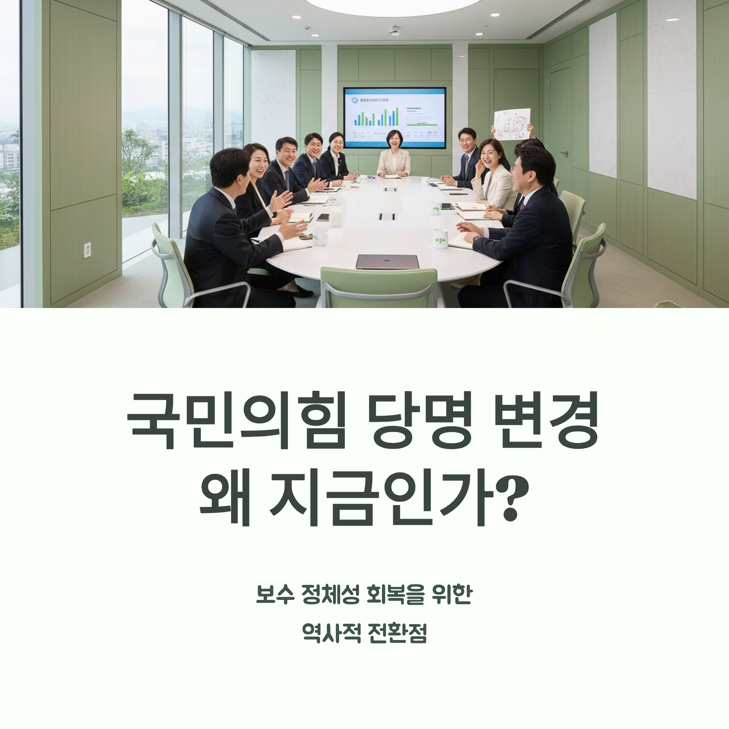 | A1. 현재의 당명 '국민의힘'은 김종인 비대위 시절 만들어진 것으로, 보수 우파의 핵심 가치인 '자유' 등의 이념이 명확히 드러나지 않는다는 비판이 많았습니다. 장동혁 대표와 당 지도부는 이재명 정부에 맞서 선명한 야당성을 확립하고, 보수 정체성을 재정립하기 위해 당명 교체를 검토하고 있습니다. |