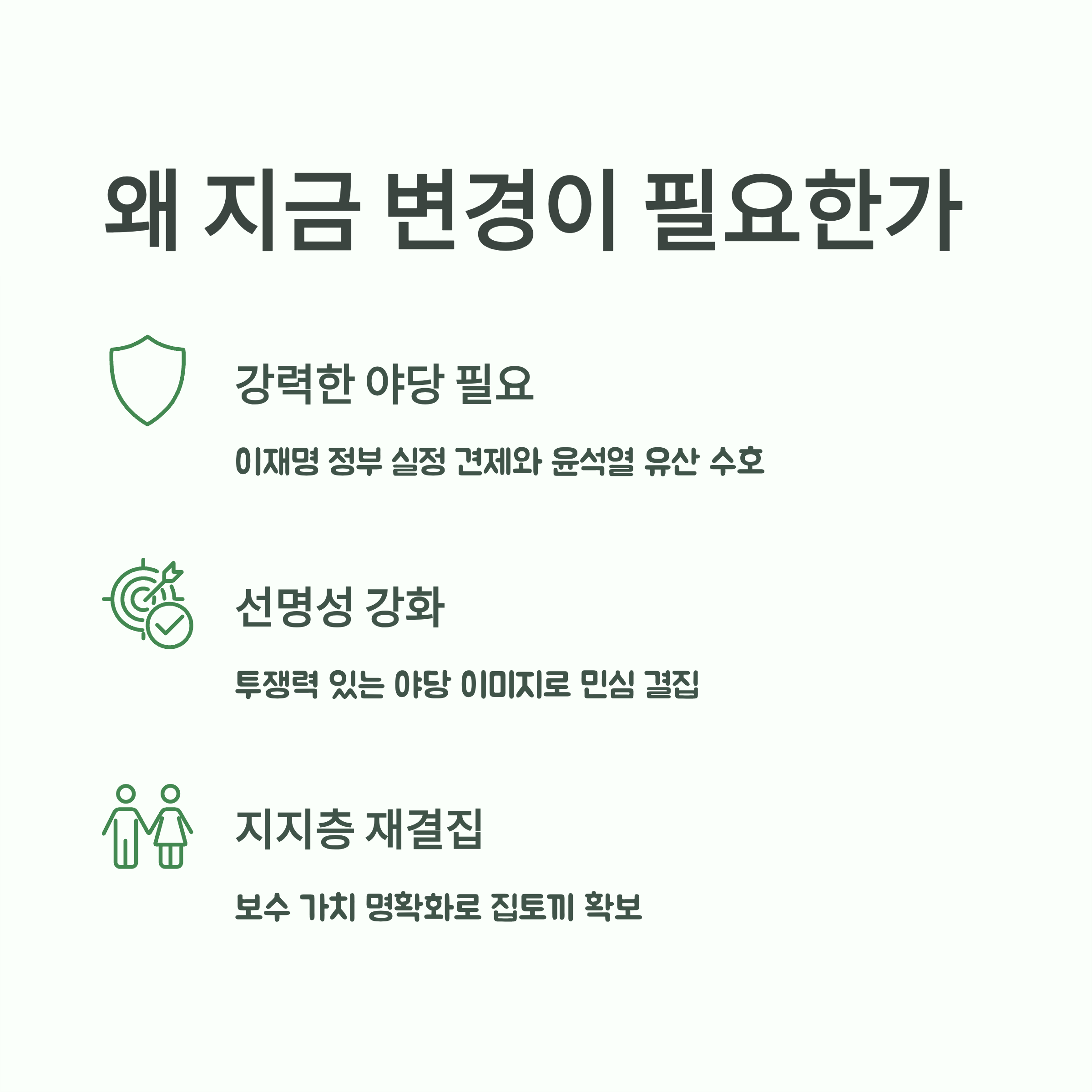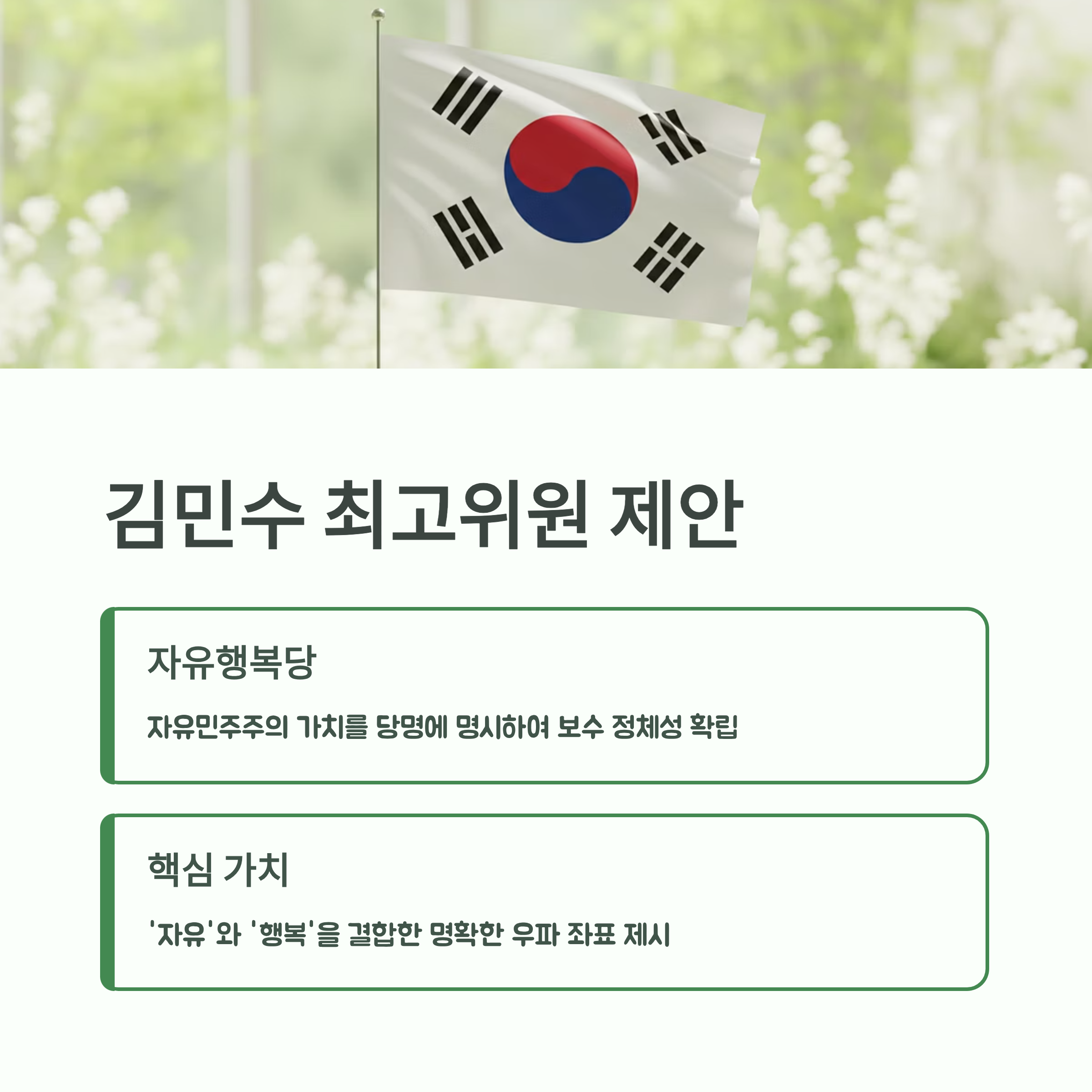 따라서 당명 교체는 이재명 정부의 폭주를 견제할 '강력한 야당'으로 다시 태어나겠다는 대국민 선언과 같습니다. 김민수 최고위원이 언급한 '자유행복당'과 같은 제안은 보수가 지켜야 할 '자유'의 가치와 국민이 누려야 할 '행복'을 결합하여, 현 정부의 포퓰리즘적 정책과 차별화된 대안을 제시하겠다는 의지입니다. 보수의 가치를 명확히 하는 것은 집토끼를 결집시키는 동시에, 현 정권에 실망한 중도층에게 확실한 선택지를 제공하는 전략적 포석이 될 것입니다.