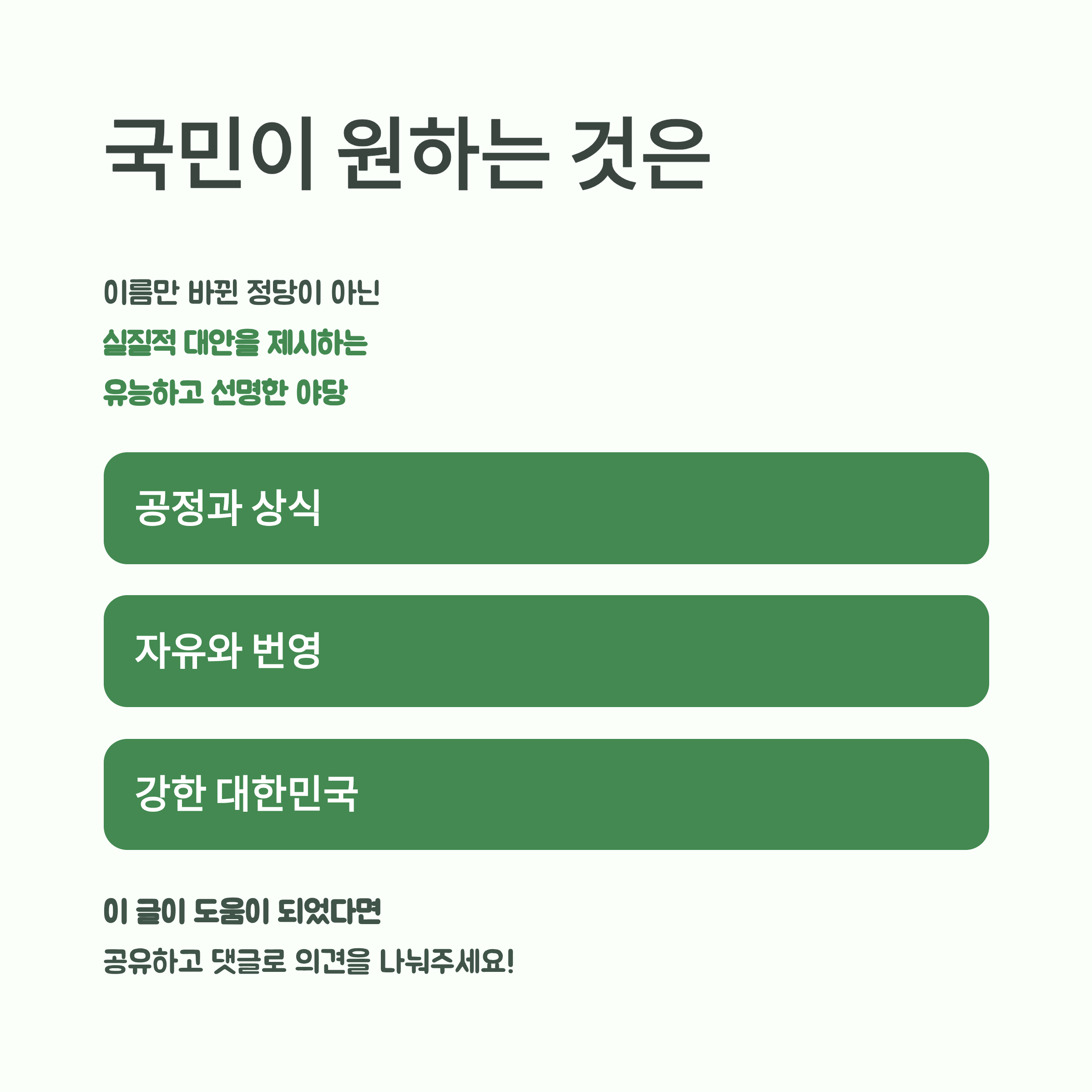 지금 국민이 원하는 것은 이름만 바뀐 정당이 아니라, 이재명 정부의 실정에 맞서 싸우고 경제 위기 속에서 실질적인 대안을 제시할 수 있는 유능하고 선명한 야당입니다. 박근혜, 윤석열 전 대통령이 추구했던 자유민주주의와 시장경제의 가치를 계승하면서도, 시대의 변화에 발맞춘 새로운 비전을 제시해야 합니다. 이번 당명 교체 시도가 보수 진영의 분열을 막고, 무너진 공정과 상식을 다시 세우는 진정한 쇄신의 출발점이 되기를 기대합니다.
