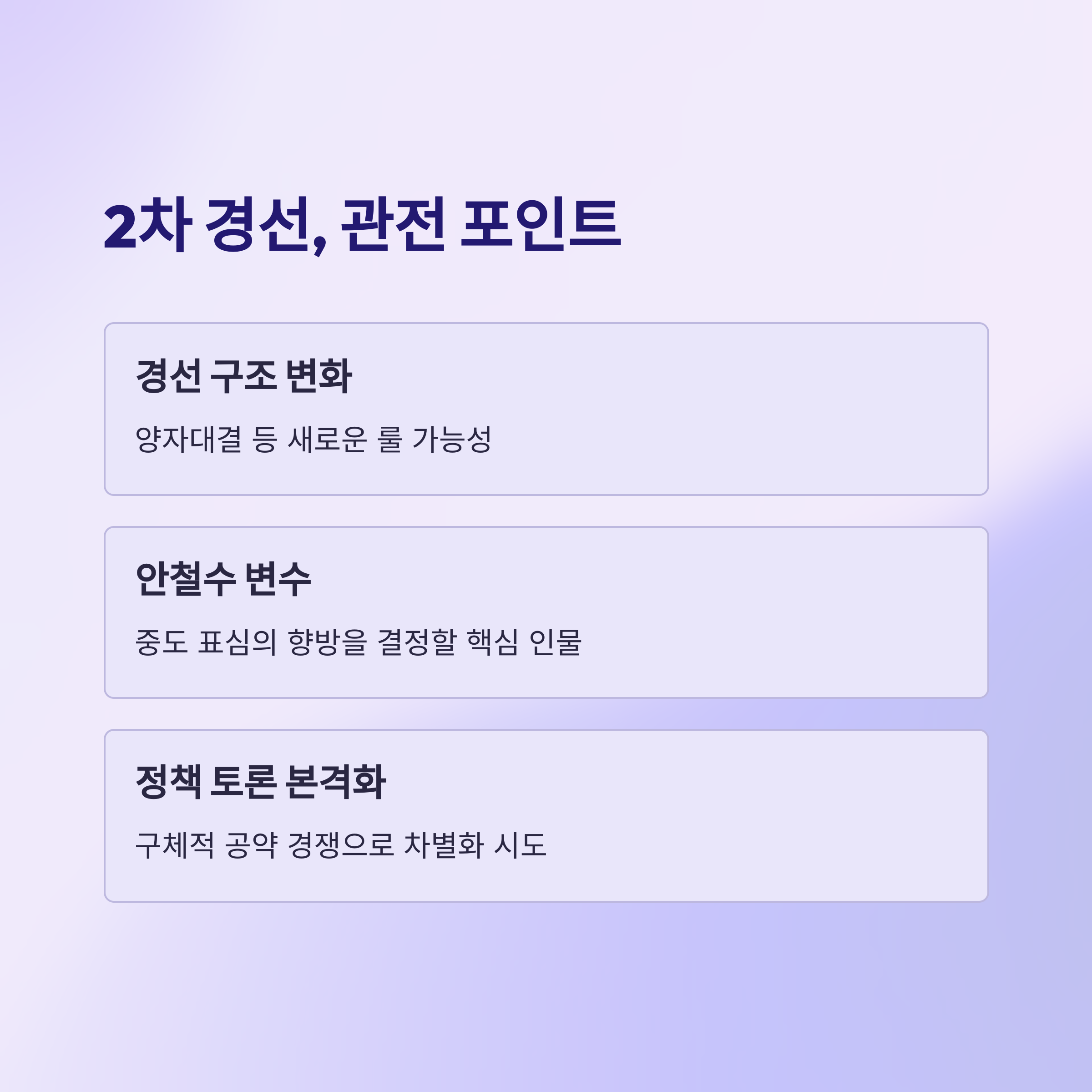 - 2차 경선은 양자대결 가능성 등이 논의되며, 안철수 후보가 중요한 변수로 떠오를 전망입니다.