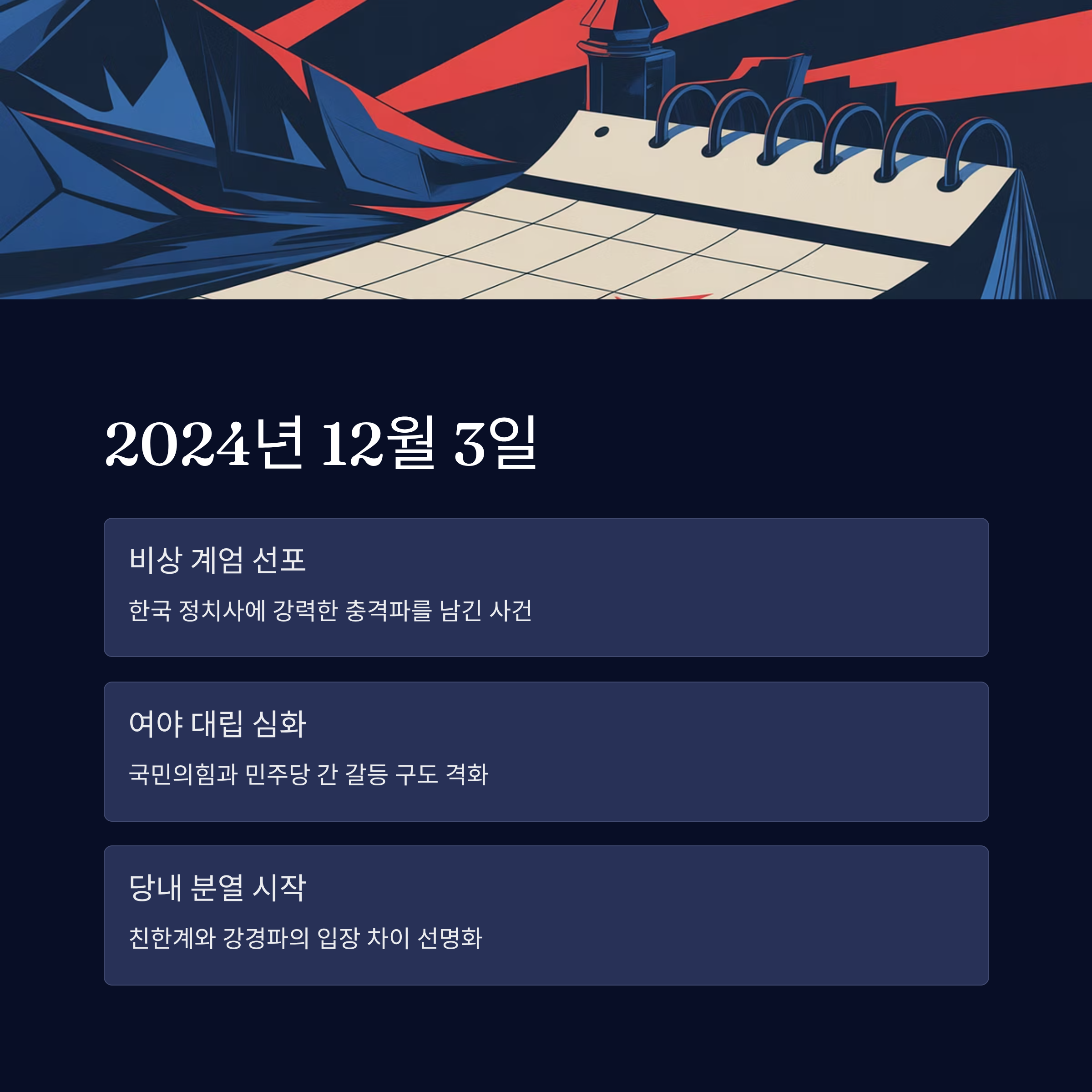 2024년 12월 3일, 비상 계엄이 선포되면서 한국 정치사에 강력한 충격파를 남겼습니다. 이는 국민의힘뿐만 아니라 민주당을 포함한 여당과 야당 간의 대립 구도를 심화시키며, 정치적 갈등의 중심으로 작용하였습니다. 당시 한동훈을 중심으로 한 친한계 세력은 이 사건에 대한 적극적 입장 표명으로 주목받았으며, 반면 다른 강경파는 정반대의 선택을 고수하며 의견의 차이를 선명히 보여주었습니다.