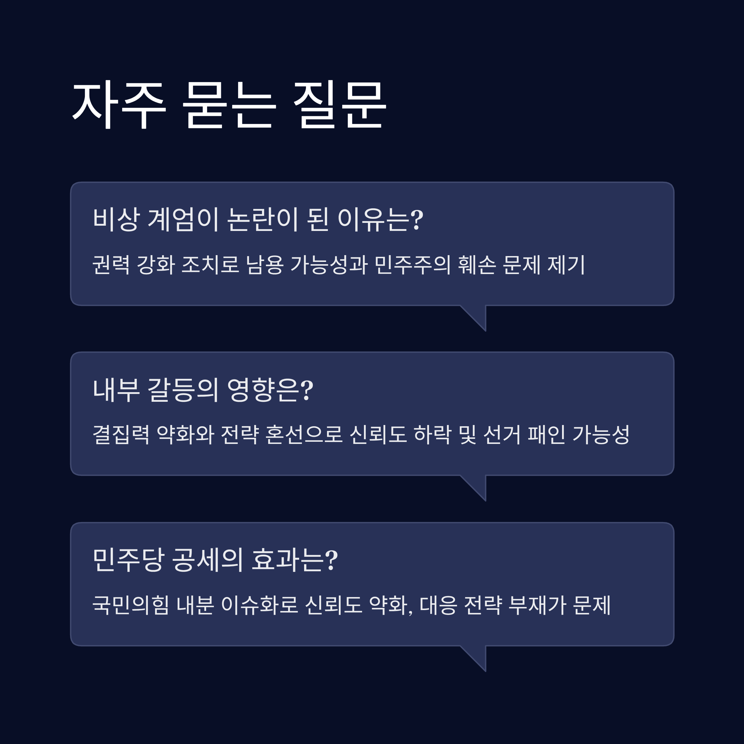 | A. 민주당은 국민의힘의 비상 계엄 관련 내분을 이슈화하며 견제와 공세를 강화했습니다. 이는 국민의힘의 신뢰도를 약화시키는 원인으로 작용했으며, 대응 전략 부재는 여론 조작을 돕는 결과를 가져왔습니다. |