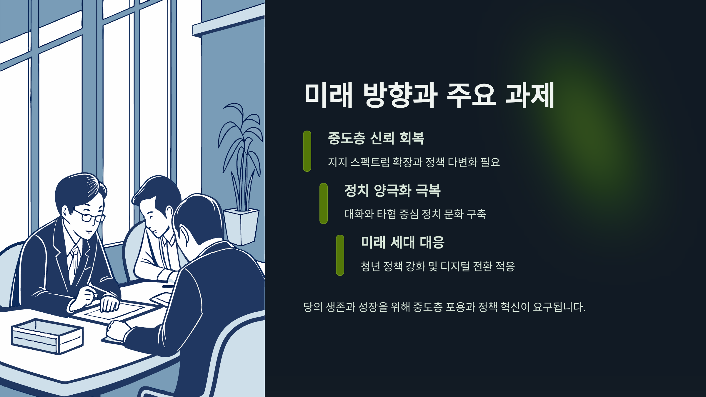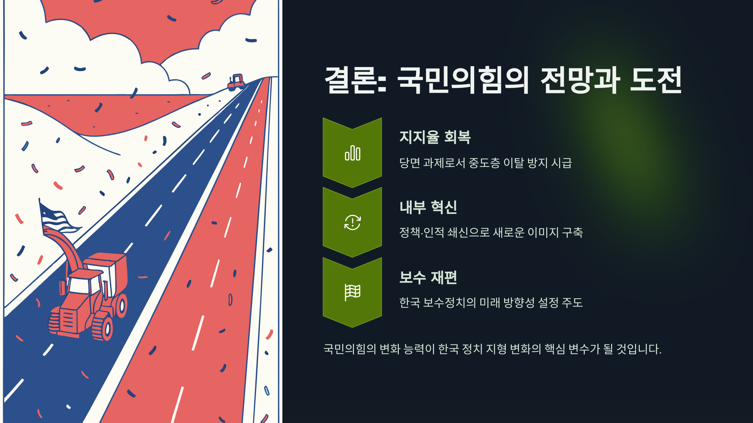 향후 국민의힘이 생존하기 위해서는 극단적 보수 이미지 탈피와 함께 중도층을 위한 실용주의적 메시지와 정책 개발이 필수적입니다. 정책 정당으로서의 체질 개선이 수반되지 않으면 수도권과 청년층에서의 확장성 확보는 어렵습니다.