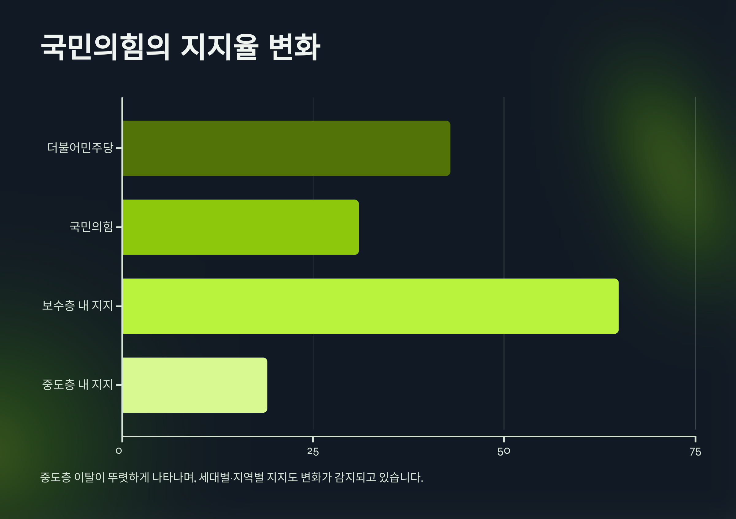 1. 국민의힘은 윤석열 전 대통령 파면 이후 지지율 하락을 경험하며 중도층에서의 지지가 약화되었습니다.