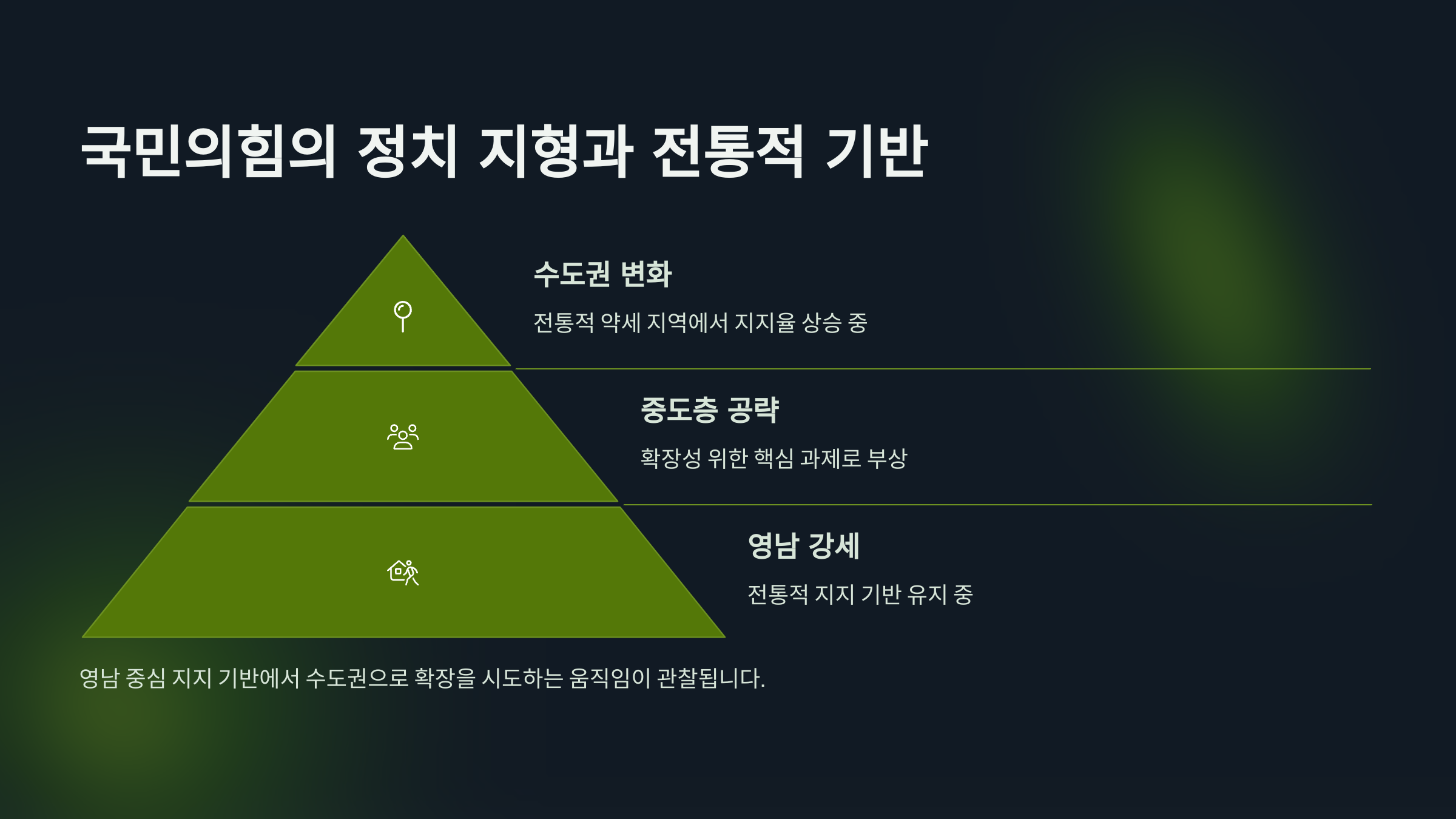 국민의힘은 여전히 영남권을 기반으로 강세를 보이고 있으나, 정치적 승부처인 수도권과 중부 지역에서는 존재감이 약화되고 있습니다. 특히 2030 세대와 젊은 전문직 유권자 사이에서 '과거 정당'이라는 이미지가 굳어지며, 국민의힘은 도시 중산층과 젊은층을 아우르는 전략 부재에 직면해 있습니다.