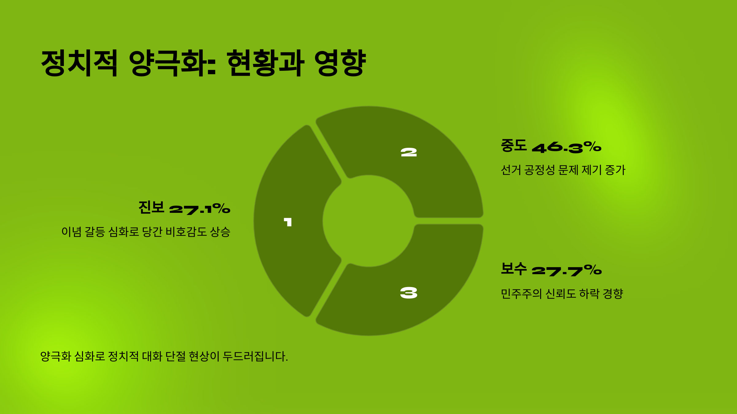최근 몇 년간 국민의힘은 더불어민주당과의 대립이 격화되는 가운데, 중도 유권자층의 신뢰를 잃어버리는 현상이 지속되었습니다. 과도한 진영 대결 구도 속에서 중도층은 양 당의 극단적 태도에 피로감을 느끼며 어느 쪽에도 확고한 지지를 보내지 않게 되었고, 이는 국민의힘이 보수층에만 의존하는 정당으로 고착화되는 원인이 되었습니다.